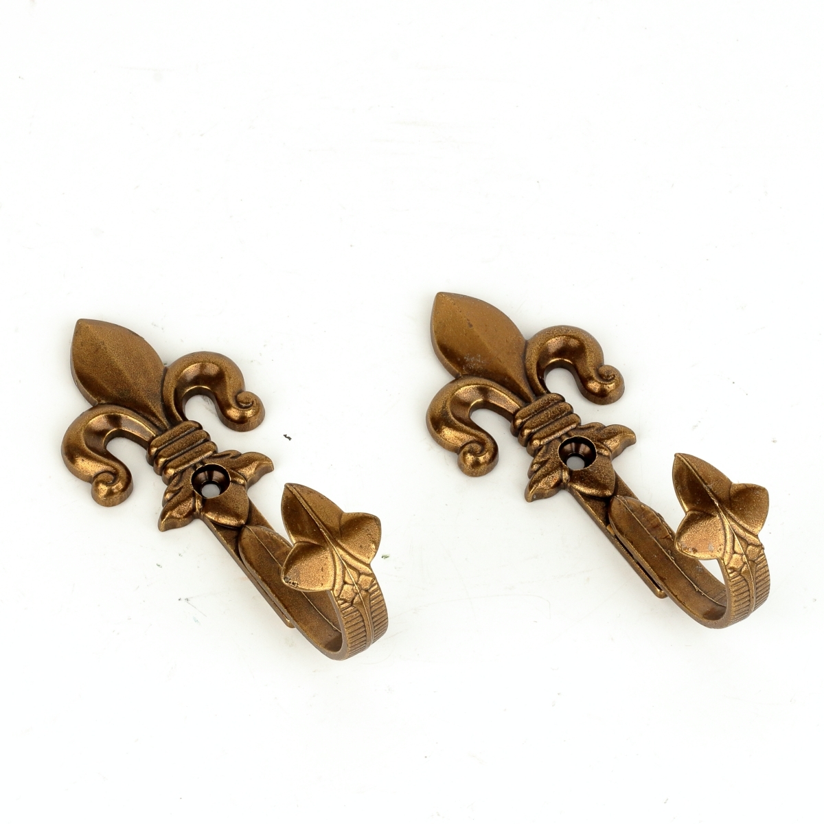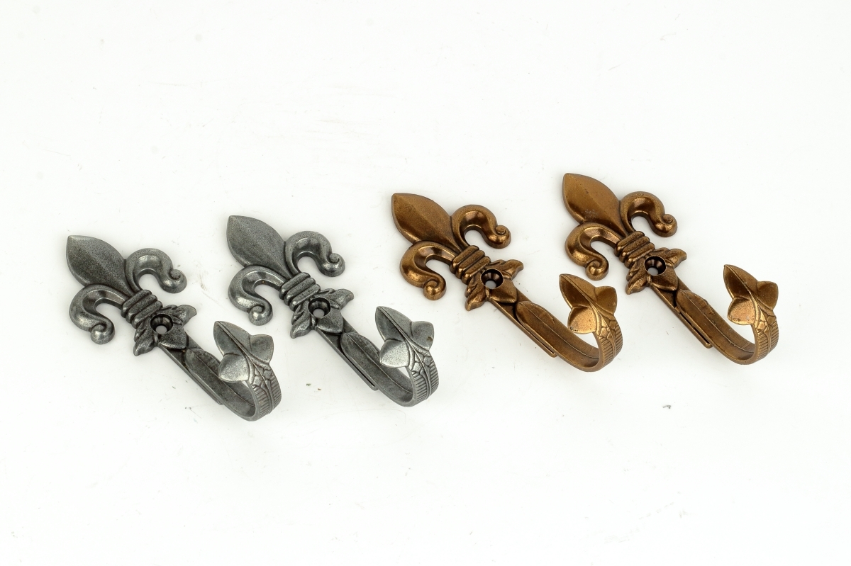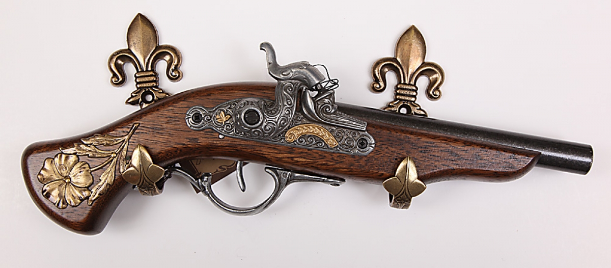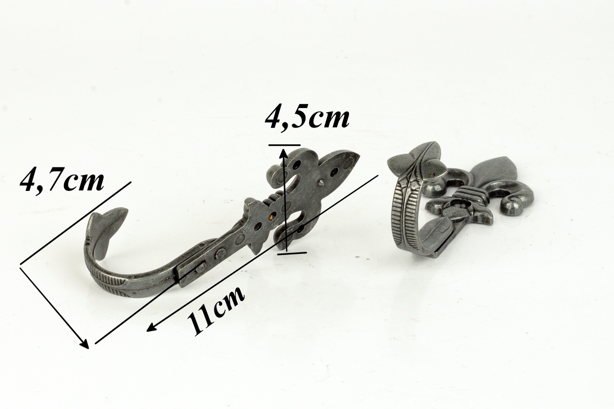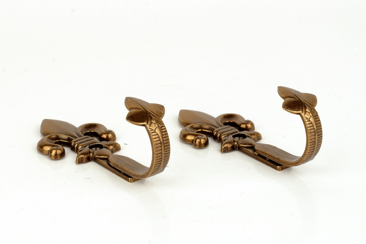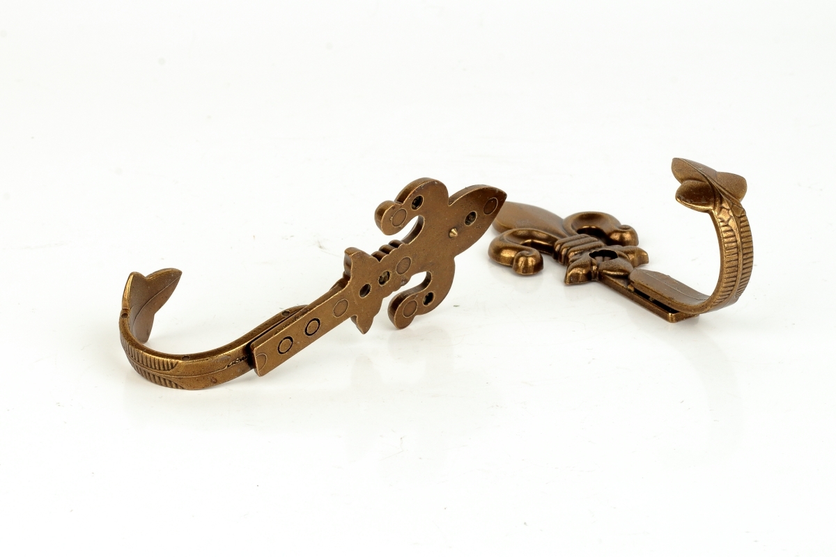 Sada dvou zdobných háčků na pistole, z kovu bronzové barvy, která je primárně určena na upevnění historických replik těchto zbraní na zeď. Jejich tvar vychází z vzorů s rostlinnou tématikou. Sběratelům těchto předmětů se jistě budou hodit. Díky nim si mohou ze své sbírky pistolí vytvořit pěknou instalaci na zdi a už se jen kochat.