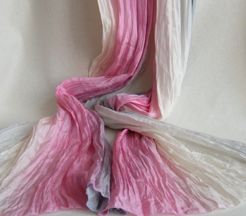 Je malována profesionálními barvami pro parní fixaci. Hedvábí tak zůstane hebké, jemné a nadýchané a barvy jsou živé a zářivé.