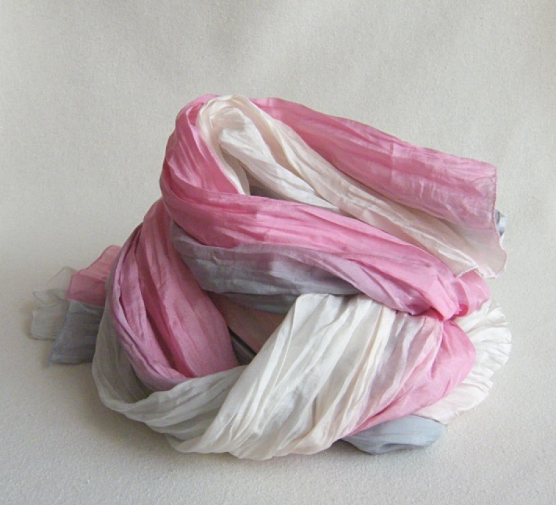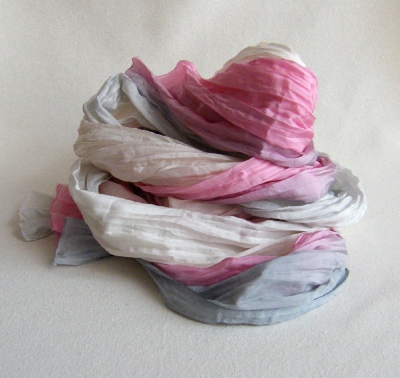 Hedvábná šála příjemné velikosti 55x200 cm. Šálu lze vyžehlit do hladka, dle chuti a vkusu následně znovu navrapovat.