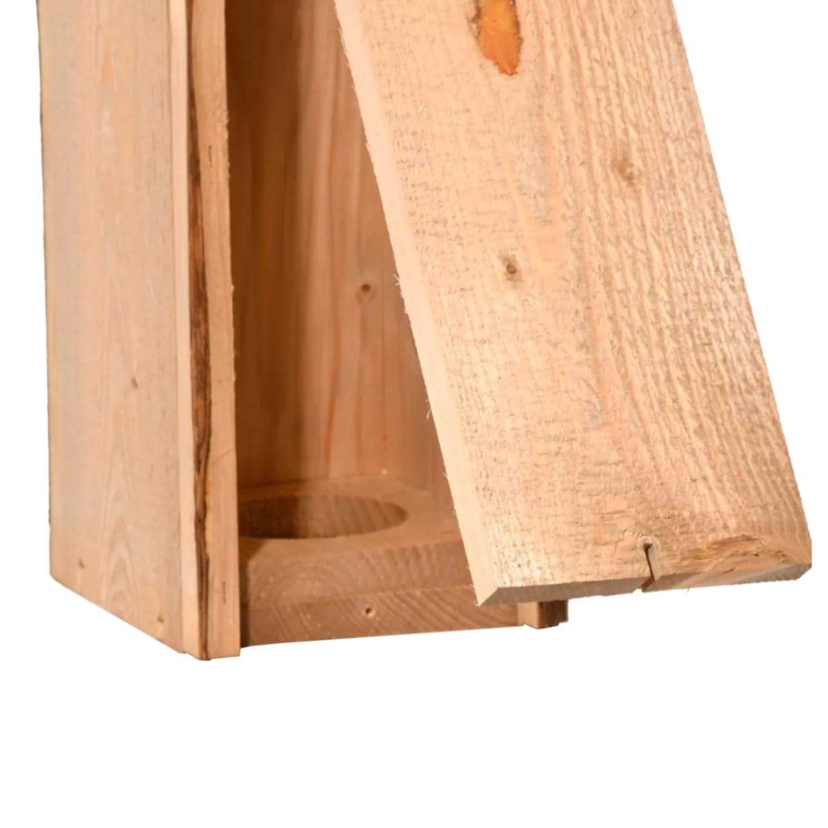 Strakapoud si v přírodě dlabe vlastní dutinu. Tam, kde chybí staré stromy, mu tato hnízdní dutina pomáhá jako přirozená náhrada. Budka pro velké dutinové ptáky. Zde se jedná již o polobudku.