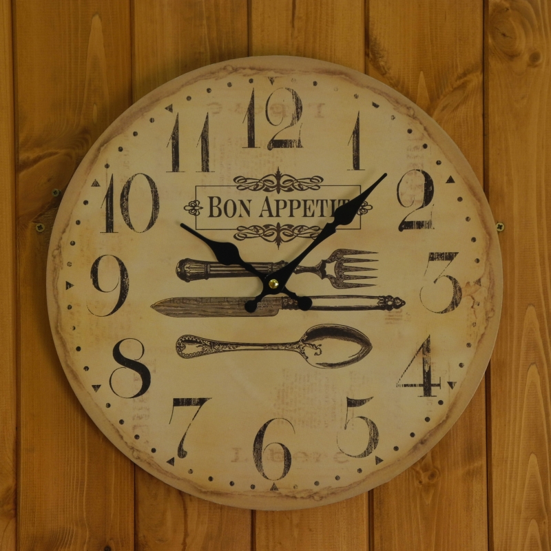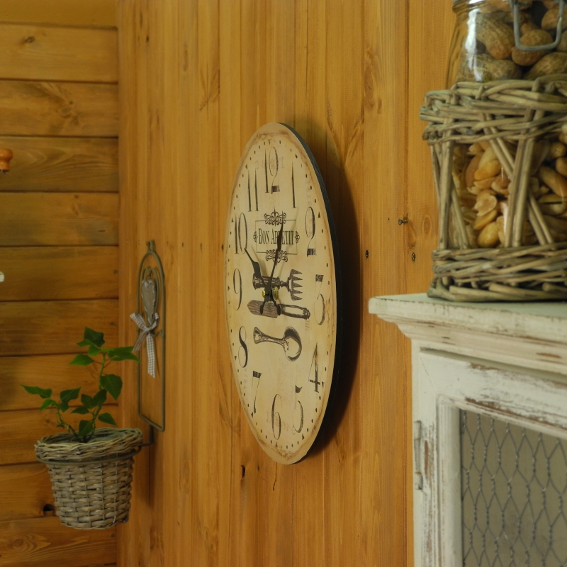 Hodiny nástěnné jsou vyrobené ze dřeva.Jejich průměr je 34cm.Hodiny mají výrazné arabské číslice.Hodí se zejména do kuchyní, bister a restaurací, poněvadž každému, kdo na ně pohlédne, popřejí dobrou chuť, i když francouzsky.Dalším výrazným zdobným prvkem hodin je vymalovaný příborový set.