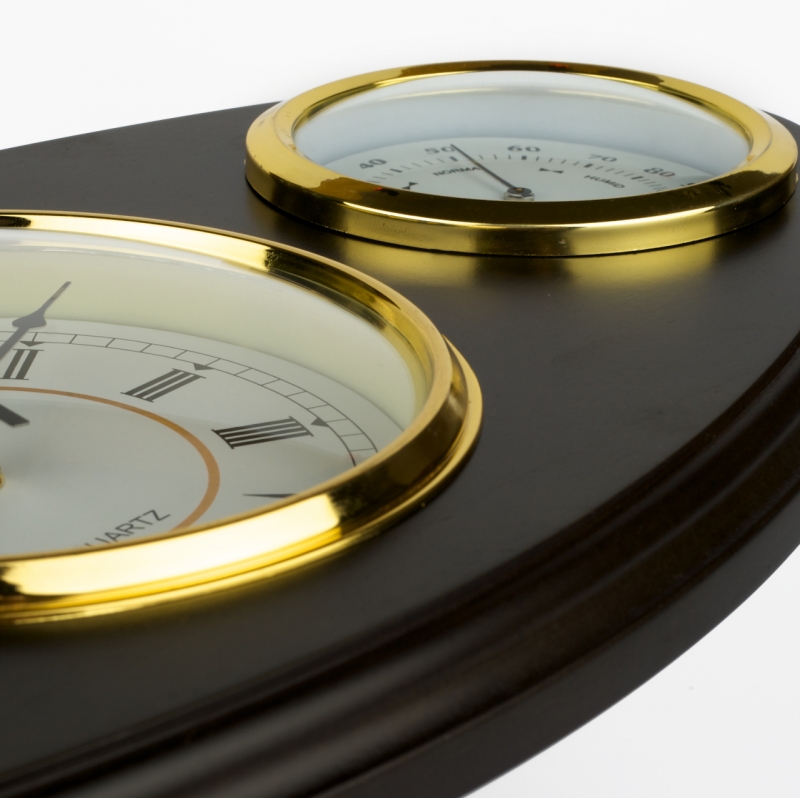 Nástěnné oválné dekorační hodiny s vlhkoměrem a hydrometrem.