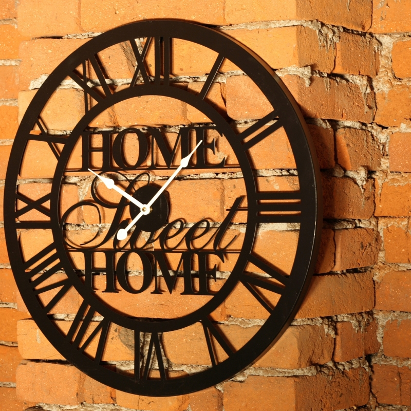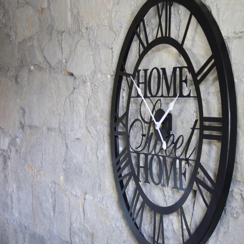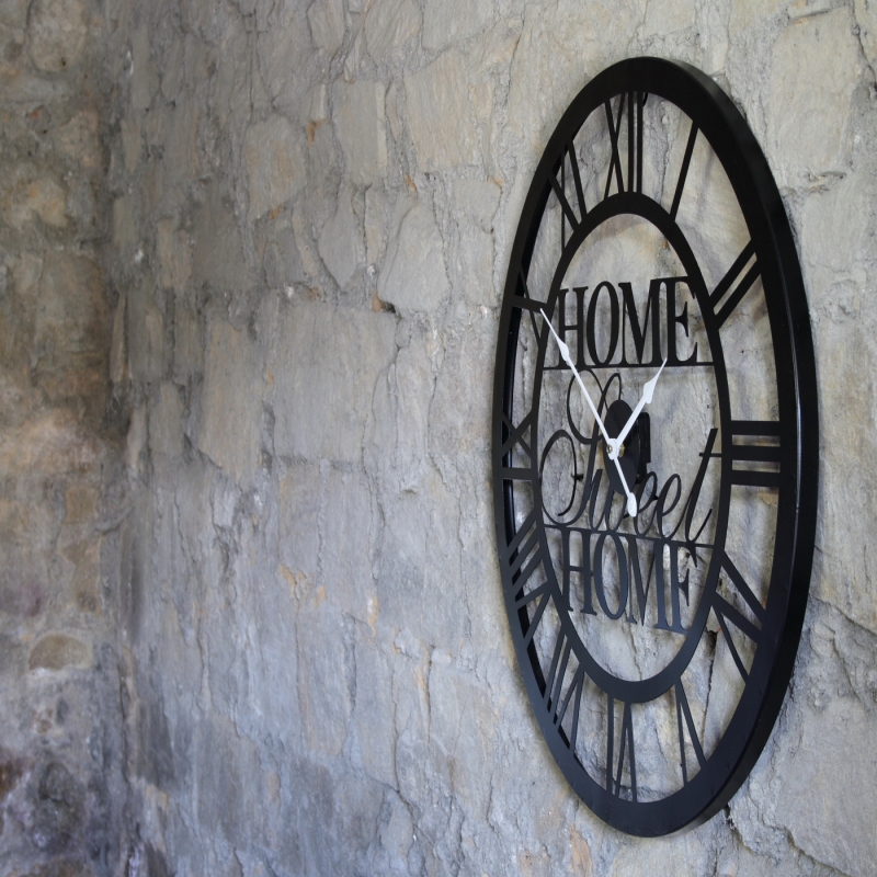 Hodiny nástěnné velké Home sweet home 60cm z černého kovu nechávají vyniknout krásu vašich stěn. Nebojte se hodiny umístit i na rustikální kamennou stěnu pod pergolu, stejně tak jako na stěnu v obývacím pokoji nebo chodbě.