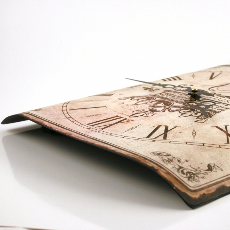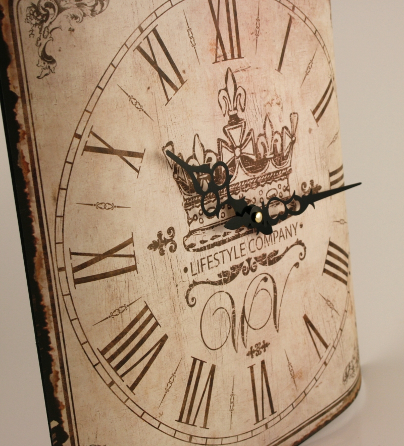 Nástěnné hodiny mají obdélníkový tvar a rozměr 35 x 30 cm. Uprostřed ciferníku je znázorněna královská koruna, zdobení najdete i v rozích těchto zajímavých hodin.