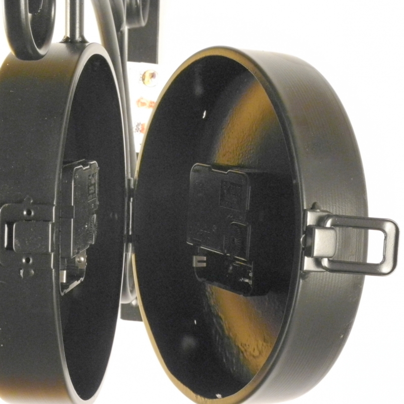 Materiál: kov, plexisklo. Chod hodin pohání dva strojky Quartz na tužkovou baterii.