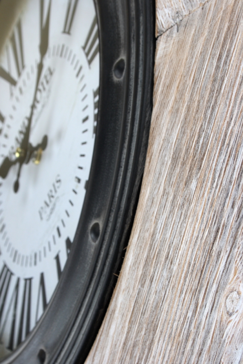 Ciferník je lemován kovovým rámem a druhým dřevěným rámem s patinou.