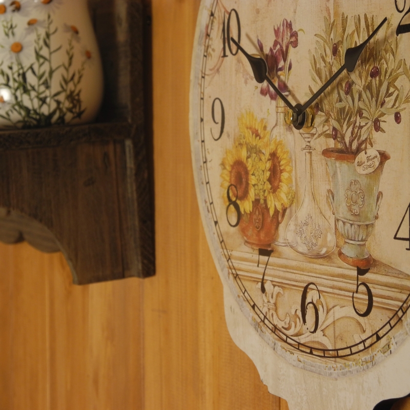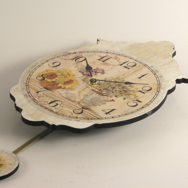 Jejich rozměr je 36x24cm, celková výška i s kyvadlem 50cm.Jak ciferník, tak kyvadlo zdobí veselý slunečnicový motiv, na ciferníku najdeme i jiné květinové dekorace.