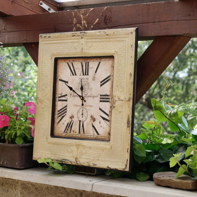 Hranaté hodiny nechávají vyniknout kontrast tmavých detailů na světlém podkladu. Rám hodin je zdoben patinou a oprýskaným vzhledem. Vyobrazený zámeček nás unáší do staré Francie a můžeme se tak cítit jako na francouzském venkově.
