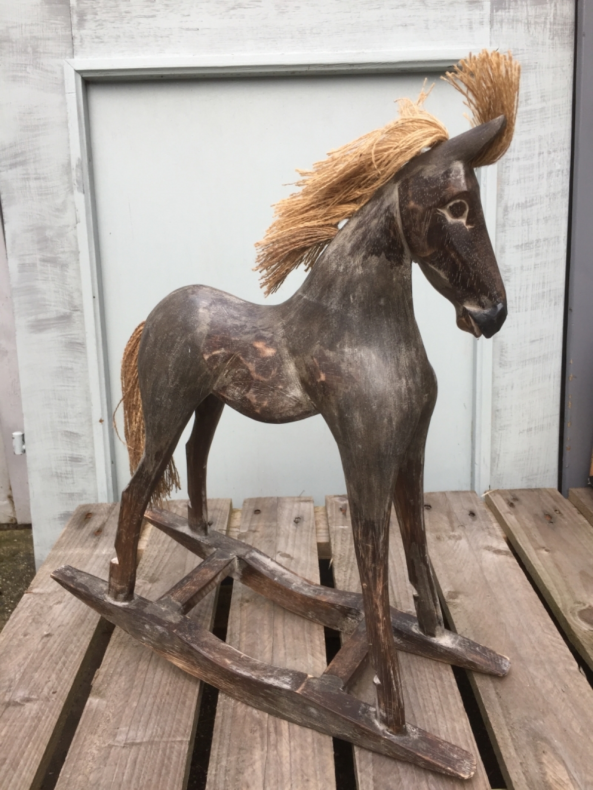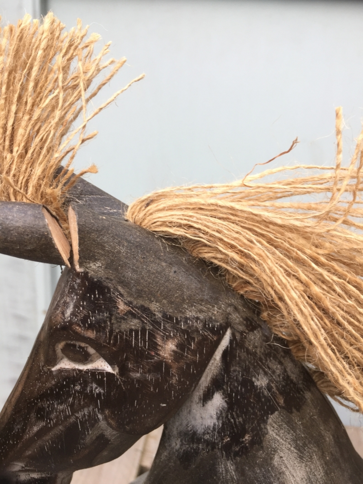 Dřevěná dekorace houpací kůň je dostupná ve třech velikostech: menší 38 cm, střední 48 cm a největší 60 cm