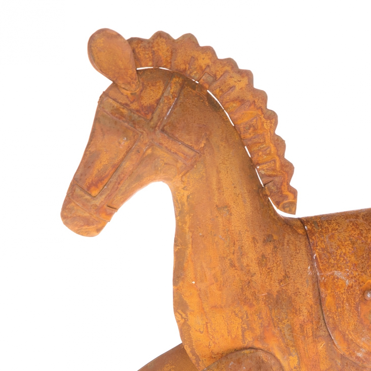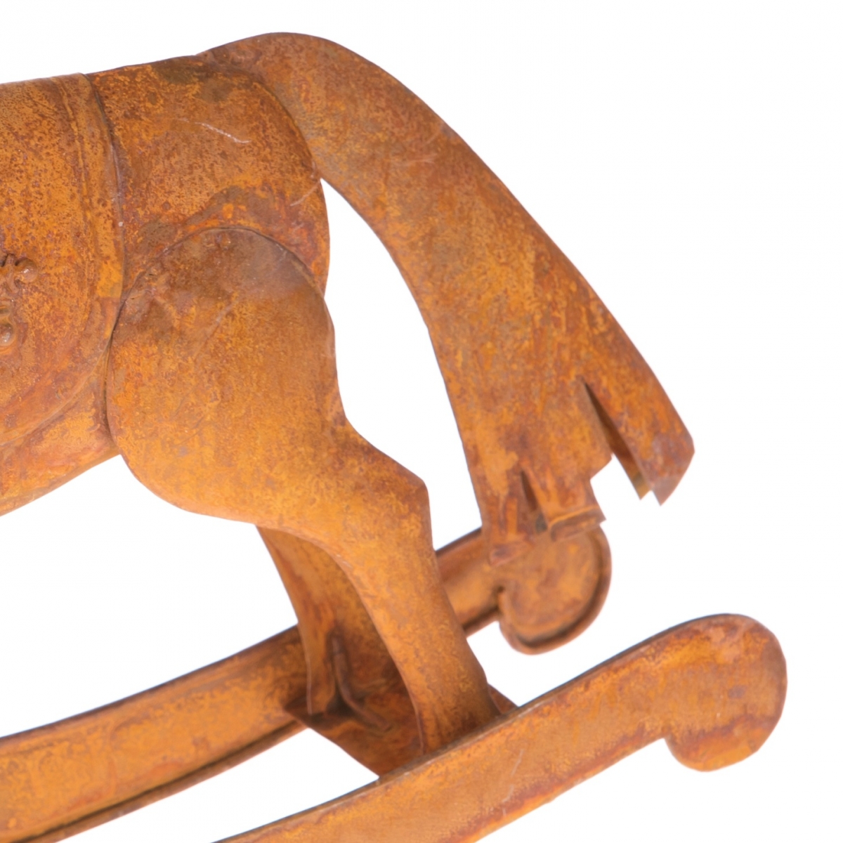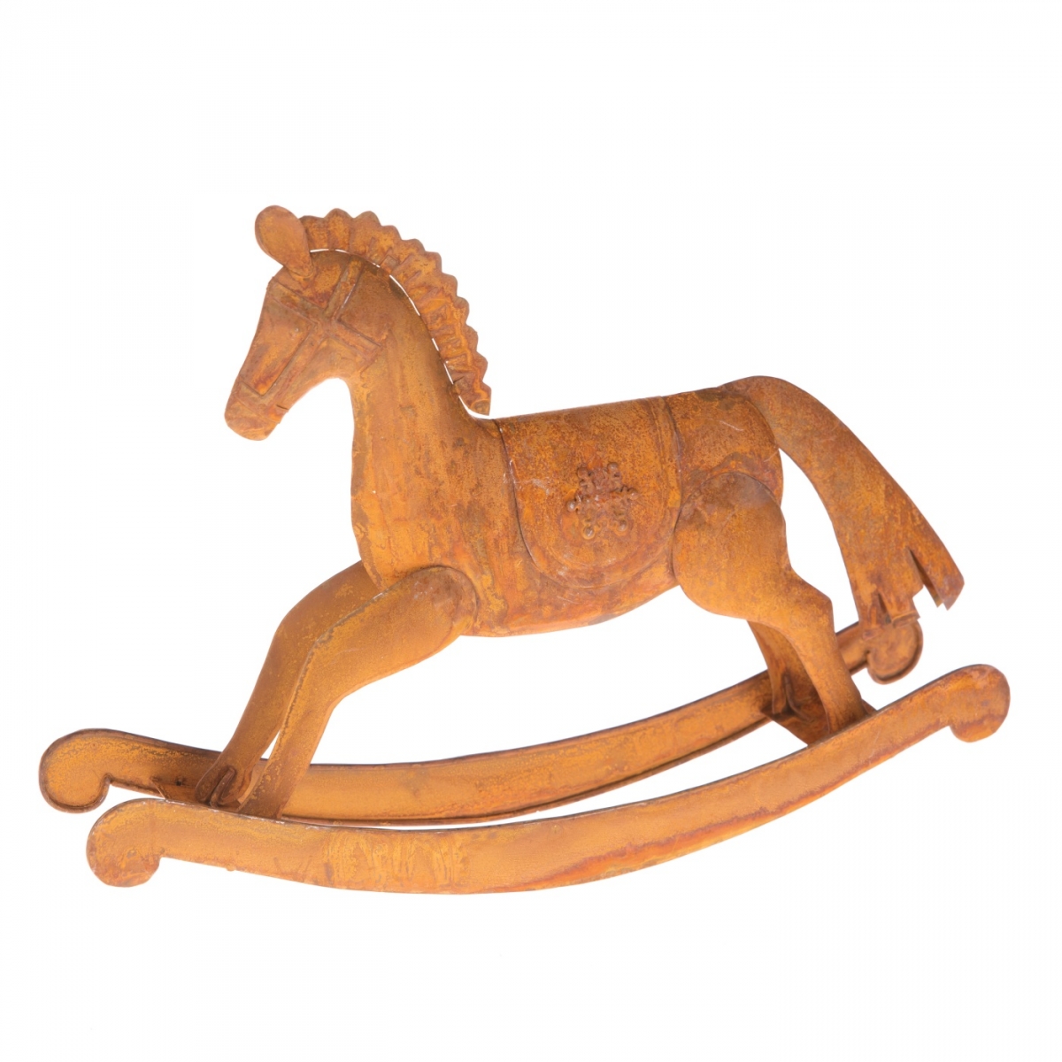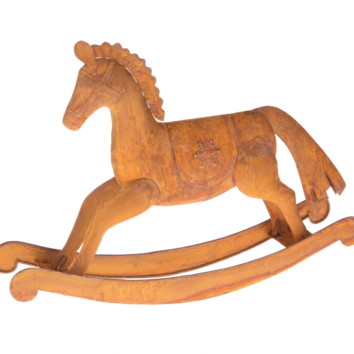Houpací koník v retro stylu z porezlého kovu. I přesto, že je dekorace zcela nová, dýchá na vás z houpacího koníka kouzlo starých časů.