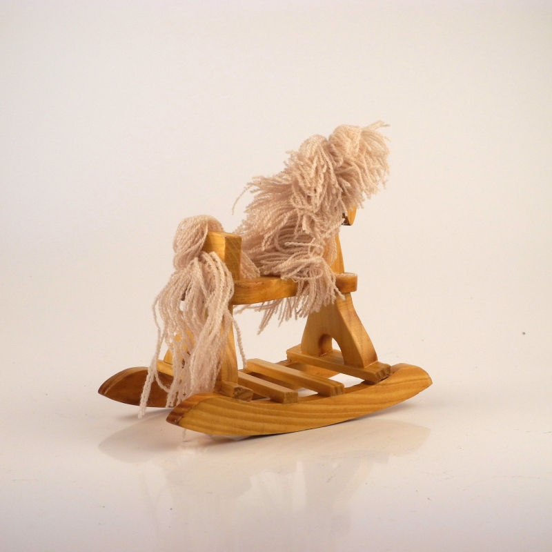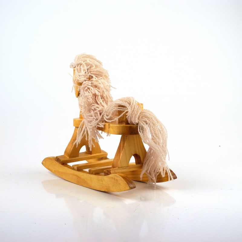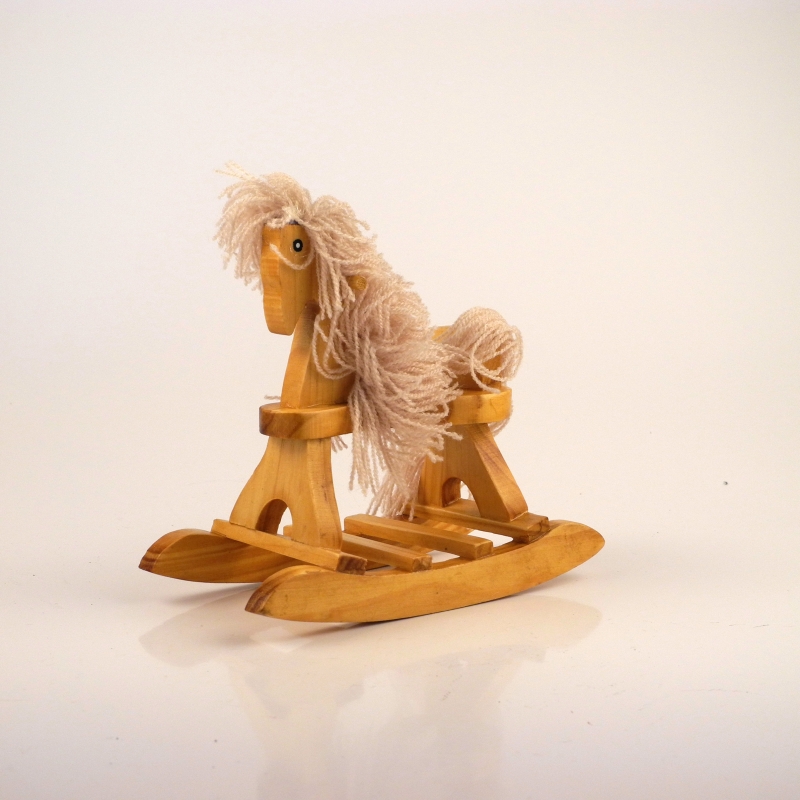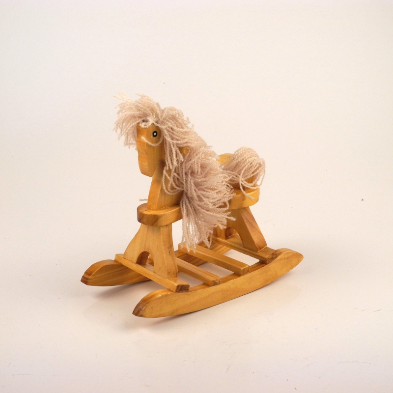 Dřevěný houpací kůň o rozměrech 14cm délka, šířka 7cm a výška 14cm.