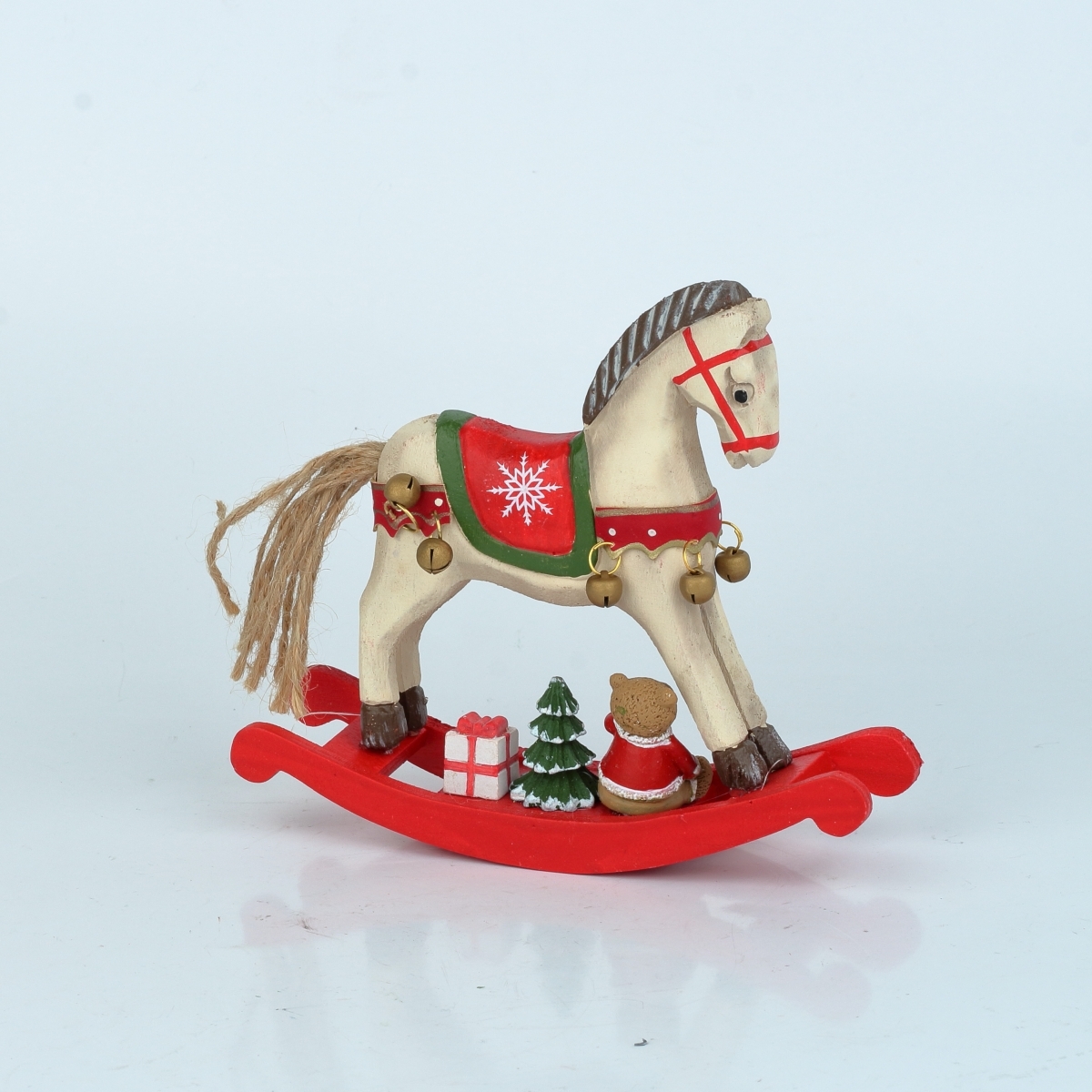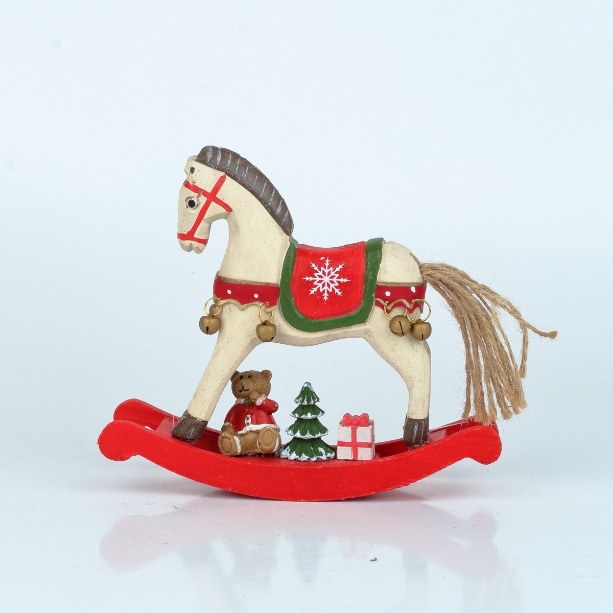 Tento bílý houpací kůň má mnoho krásných detailů, které společně vytvářejí opravdu okouzlující vánoční dekoraci. Zelená a červená barva jsou tradičními vánočními barvami a běloušovi velmi sluší. Pod koníkem je umístěn malý stromeček dárek a mávající medvídek v červeno bílém kabátku.