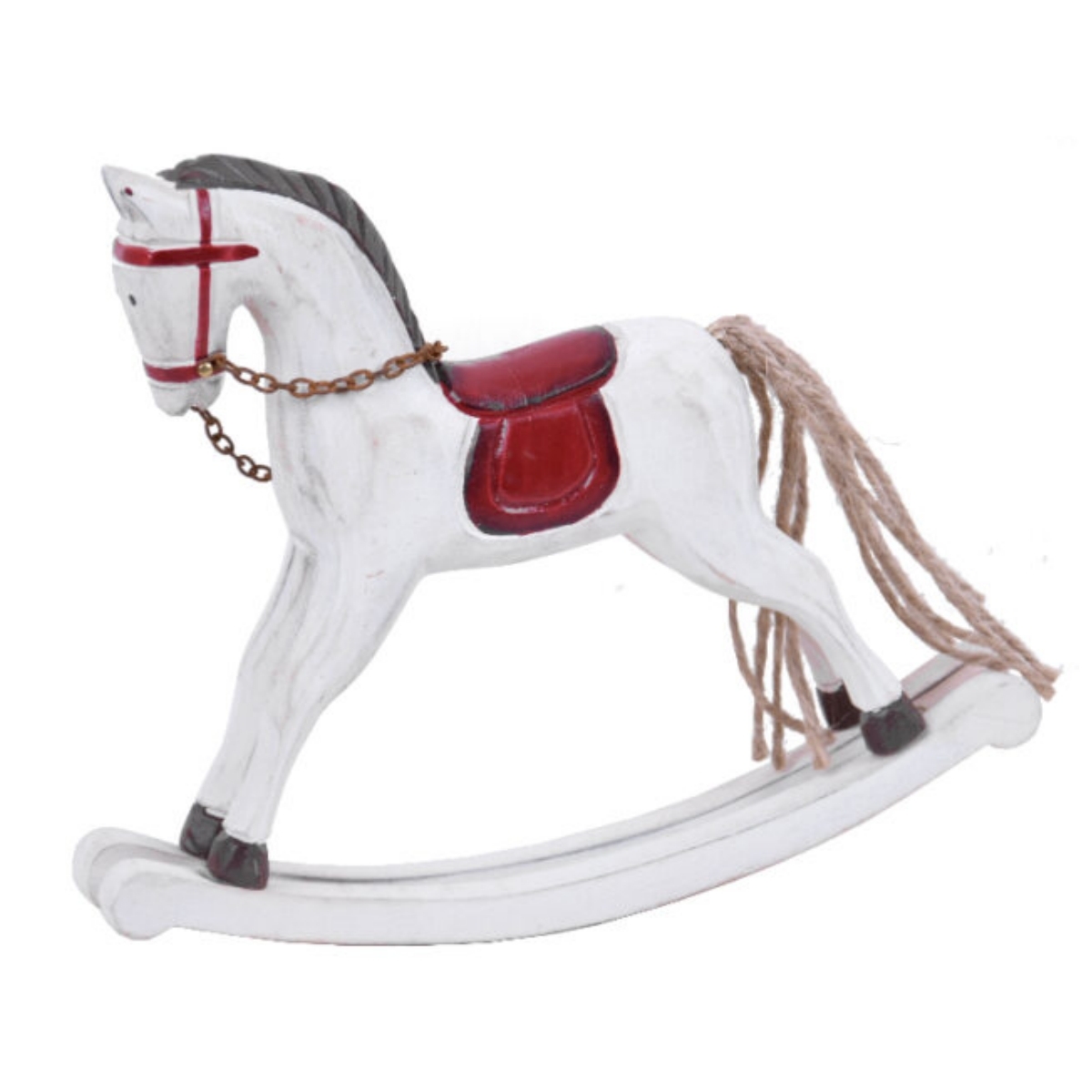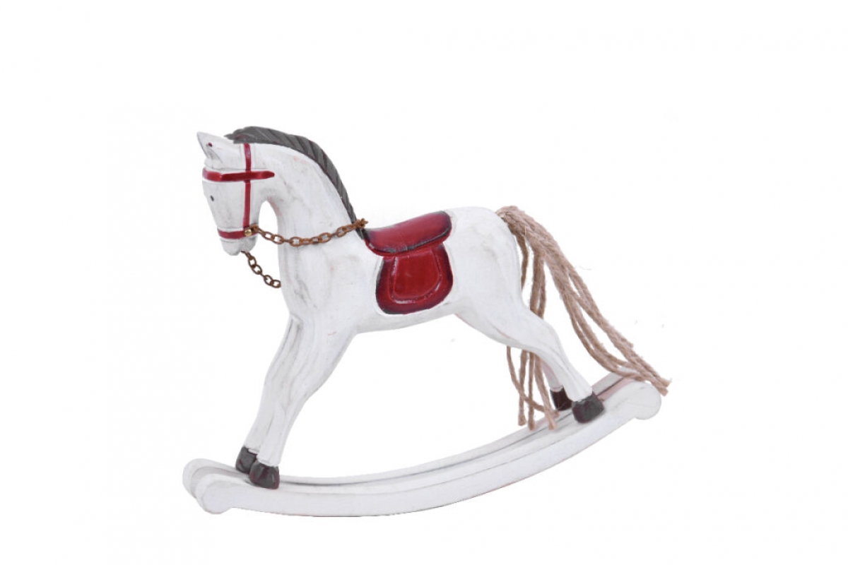 Krásný bílý houpací kůň, připomínající hračku z dob minulých. Vyroben ze dřeva s ocasem z provázků a ručně malovanými detaily. Zaujme na první pohled červeným sedlem a ohlávkou.