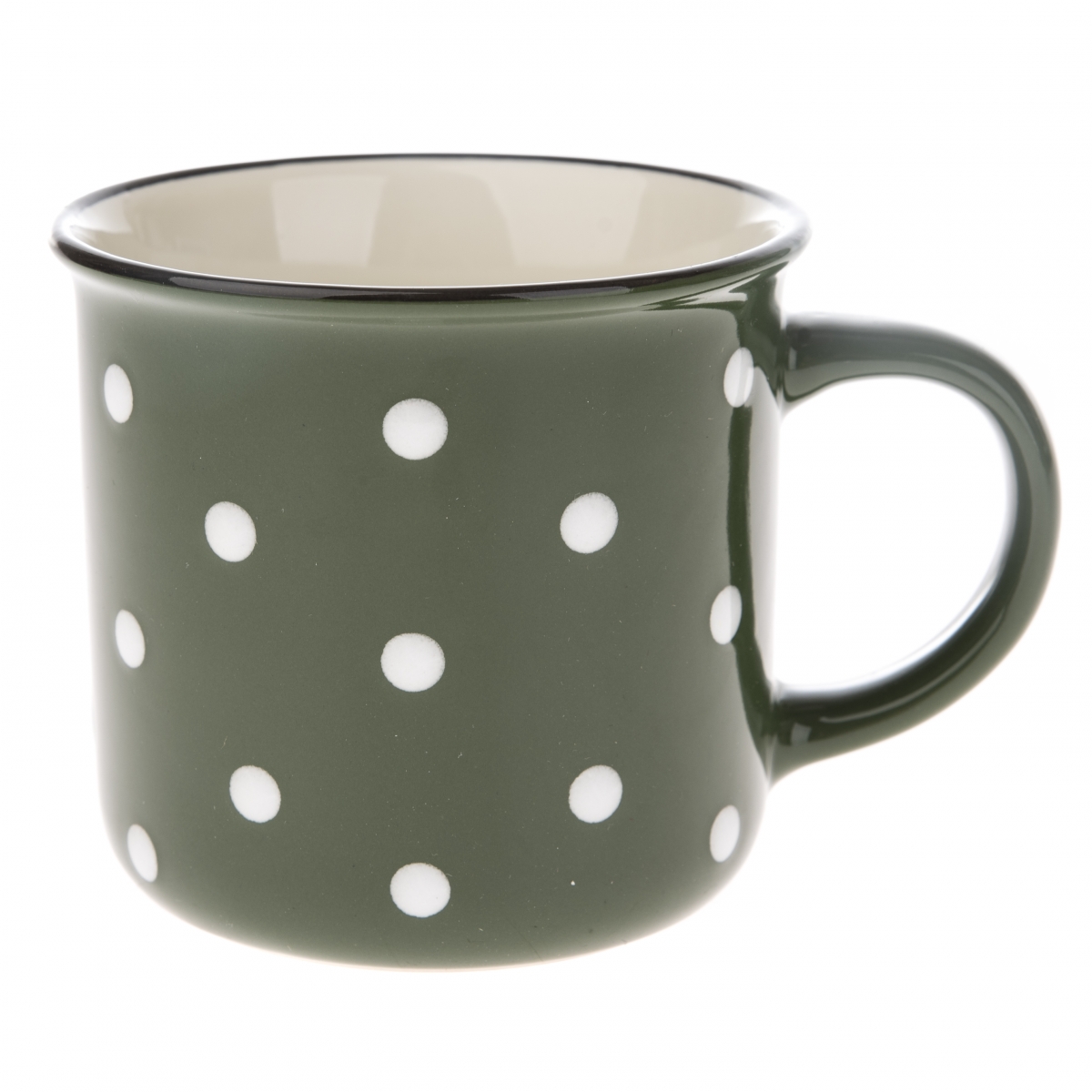 Tento nádherný hrnek na kávu v zelené barvě s puntíky se jistě brzy stane vaším oblíbeným. Nejen, že krásně vypadá, ale díky svému objemu se hodí jak na kávu, tak na čaj nebo kakao.