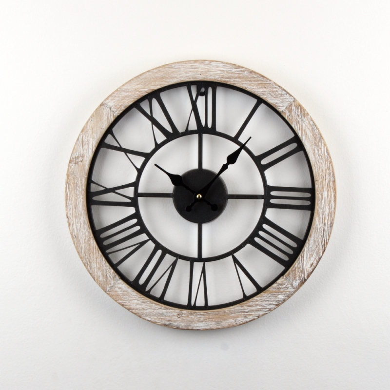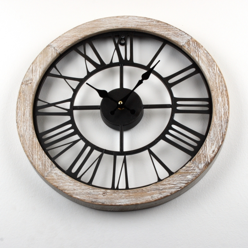 Kovové "prázdné" hodiny s dřevěnou obručí jsou velmi elegantní. Dřevěný okraj hodiny je zdoben patinou a kovový ciferník je jakoby umístěn přímo na zdi.