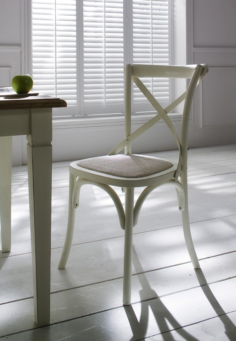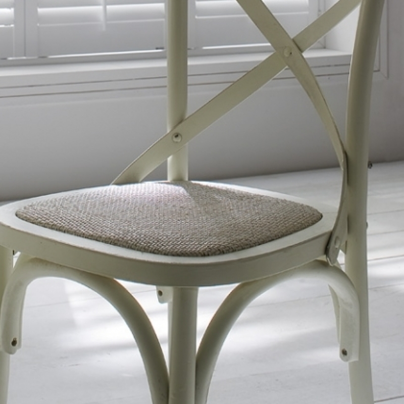 Židle má vyplétaný sedák v přírodní režné barvě, dřevěné části židle jsou bílé.