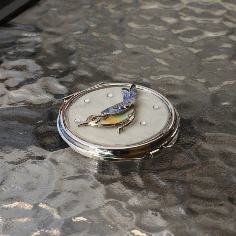 Kulaté zrcátko je zasazeno do kovové vložky, na horní straně je krásná aplikace s motivem ptáčka.