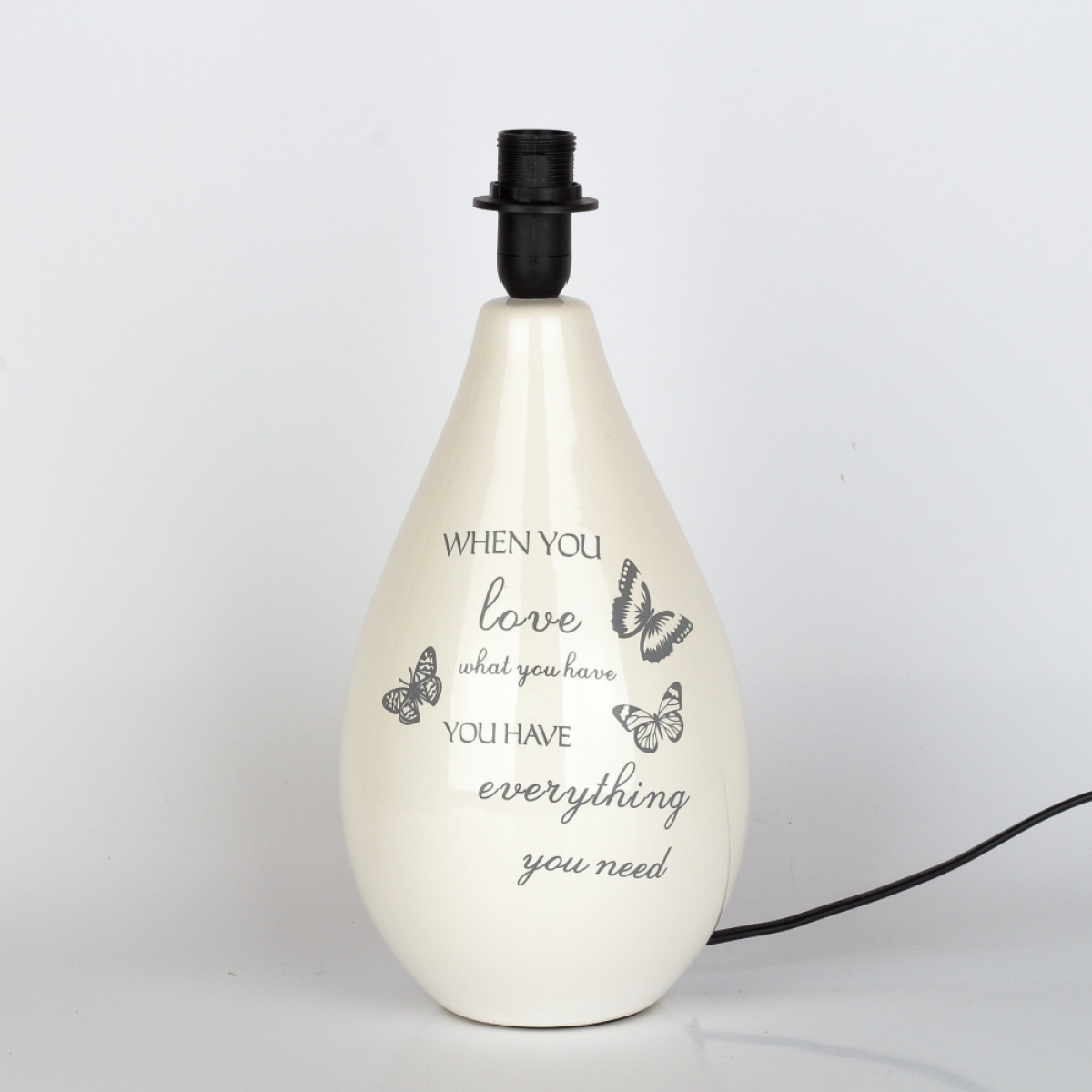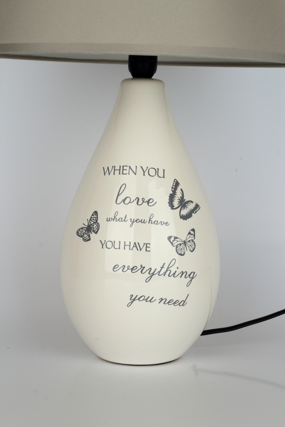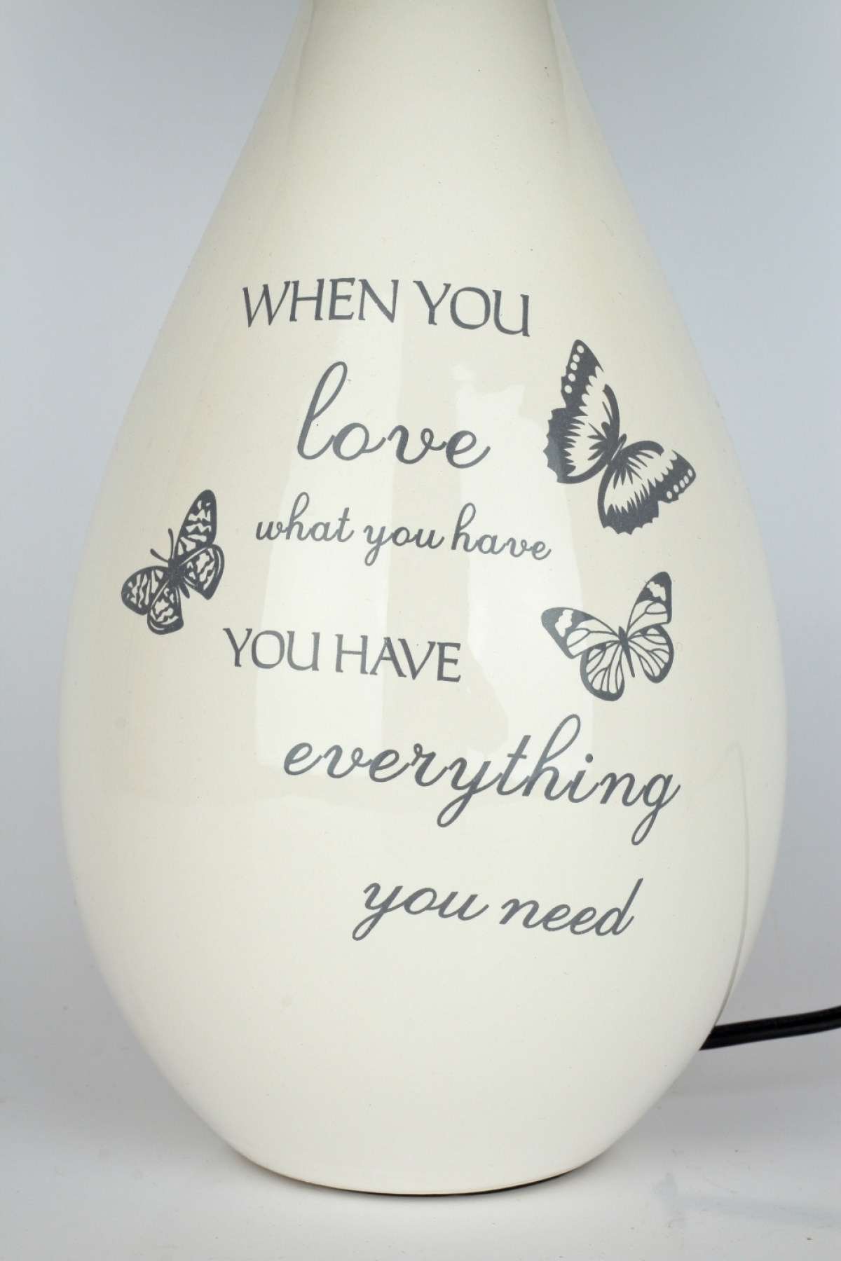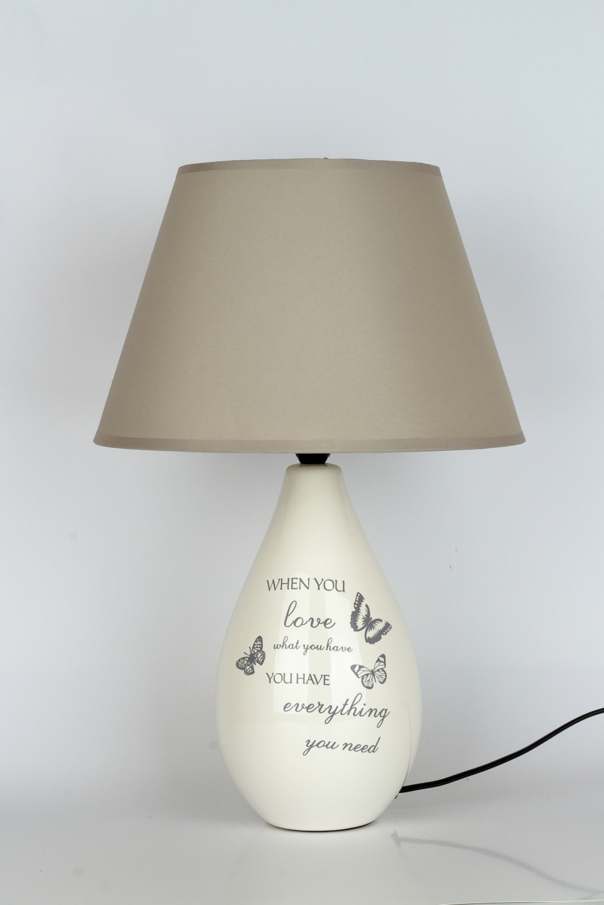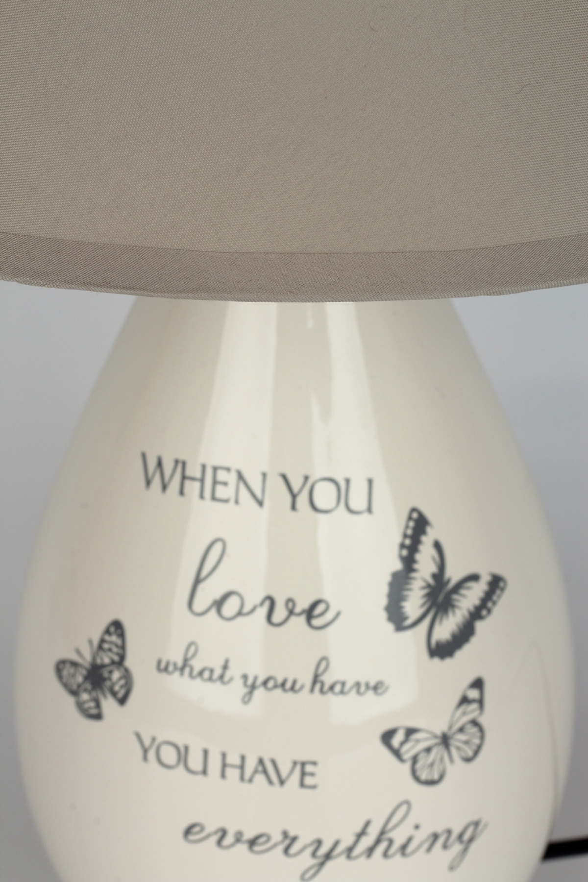Stolní lampy patří nejen na noční stolky do ložnice, ale i jako doplňkové osvětlení do chodeb a společenských prostor. Keramická noha lampy je zdobená motivem motýlů a drobného textu.