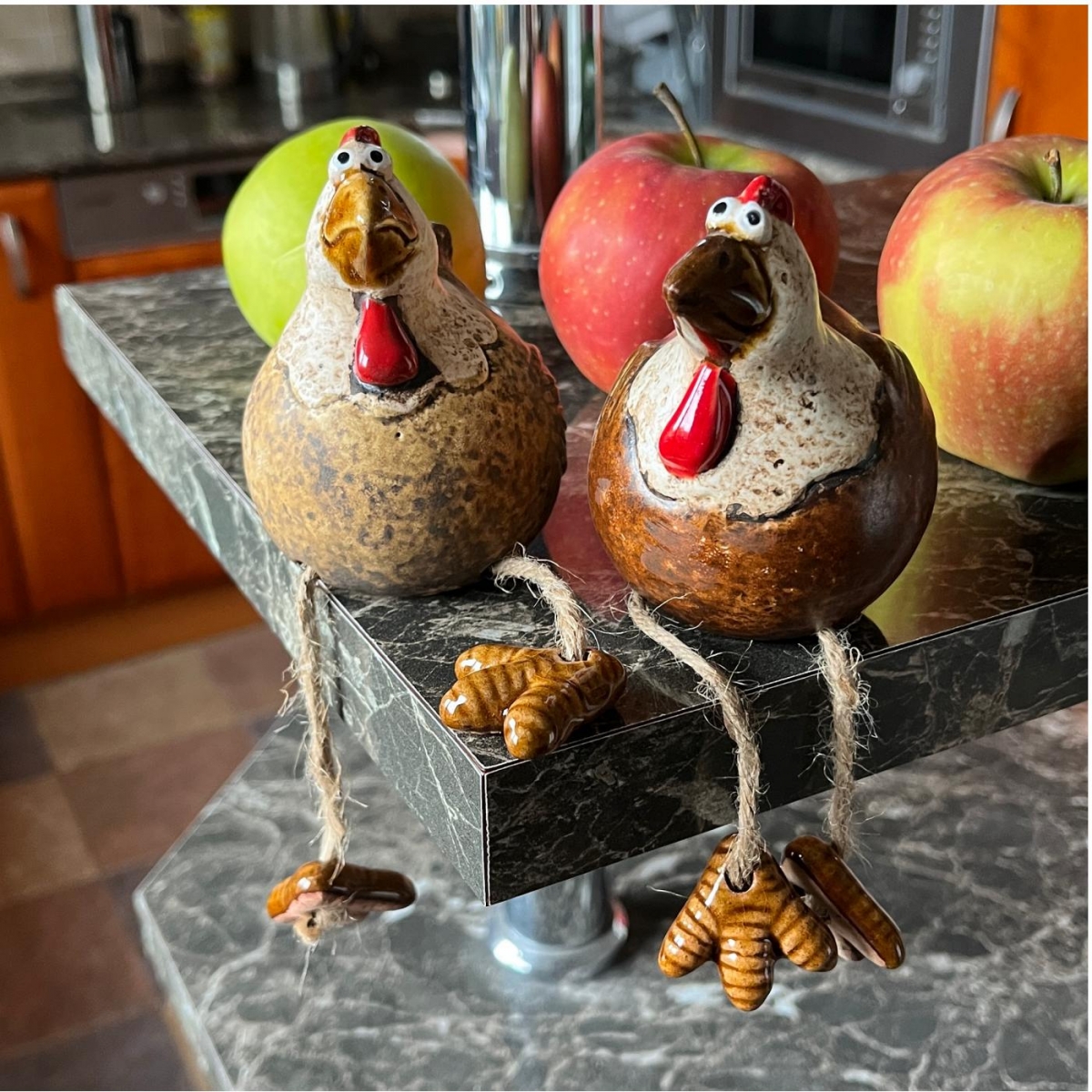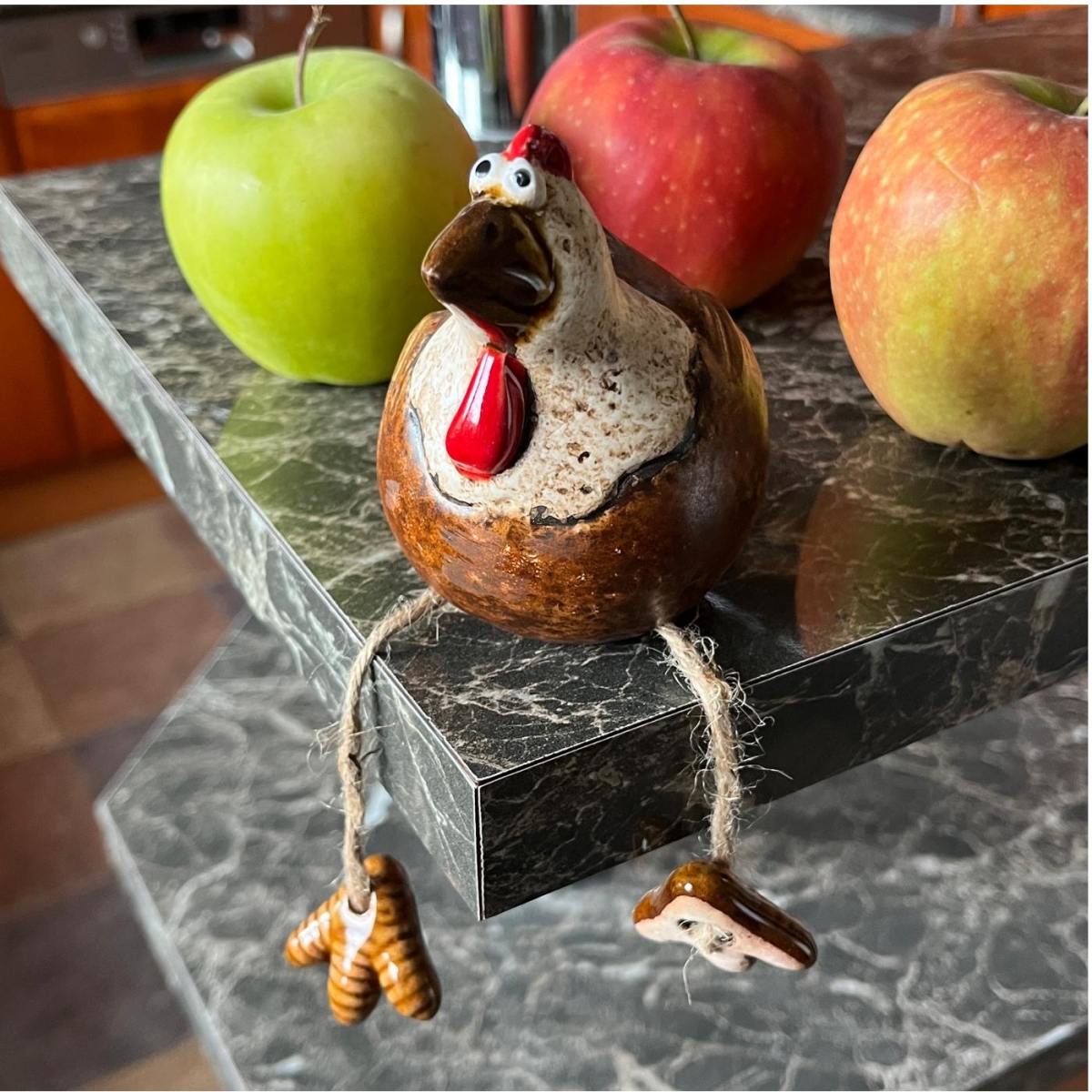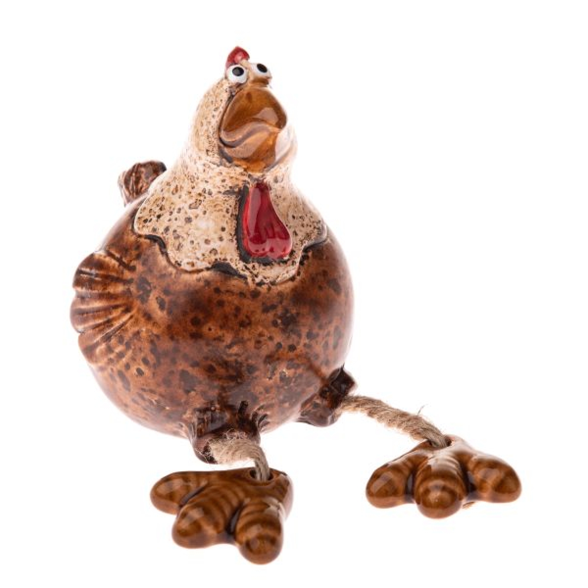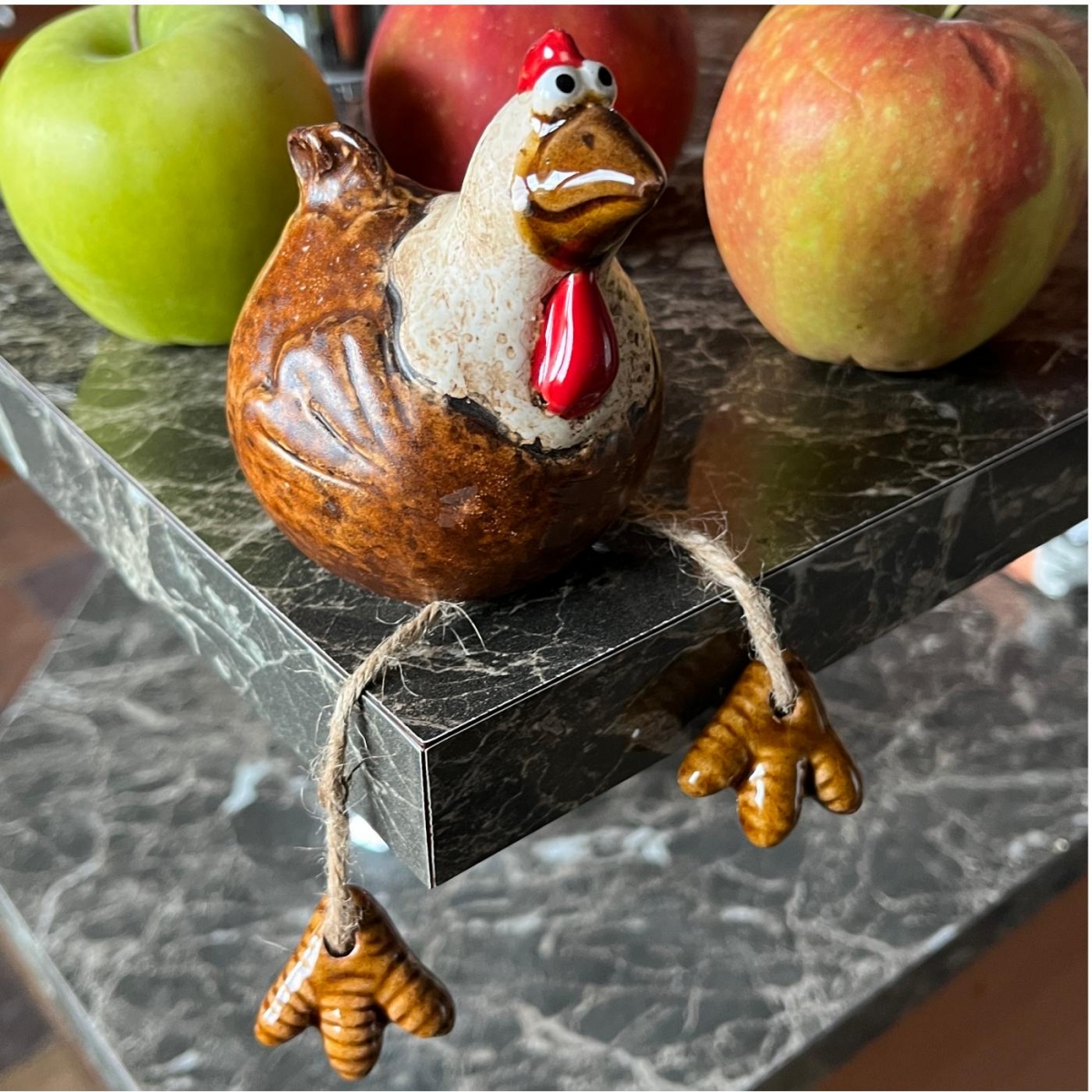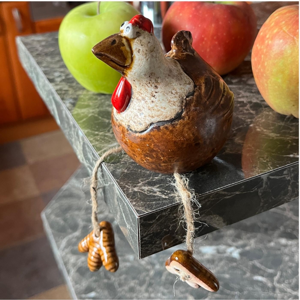 Keramická slepička s visícími nožkami je drobná dekorace, která si snadno najde své místo tam, kde chcete domov doladit jemným a nápaditým detailem. Krásně vynikne na kuchyňské lince, na polici, na komodě, na parapetu i ve venkovském stavení, kde podtrhne útulný a poctivý styl bydlení.