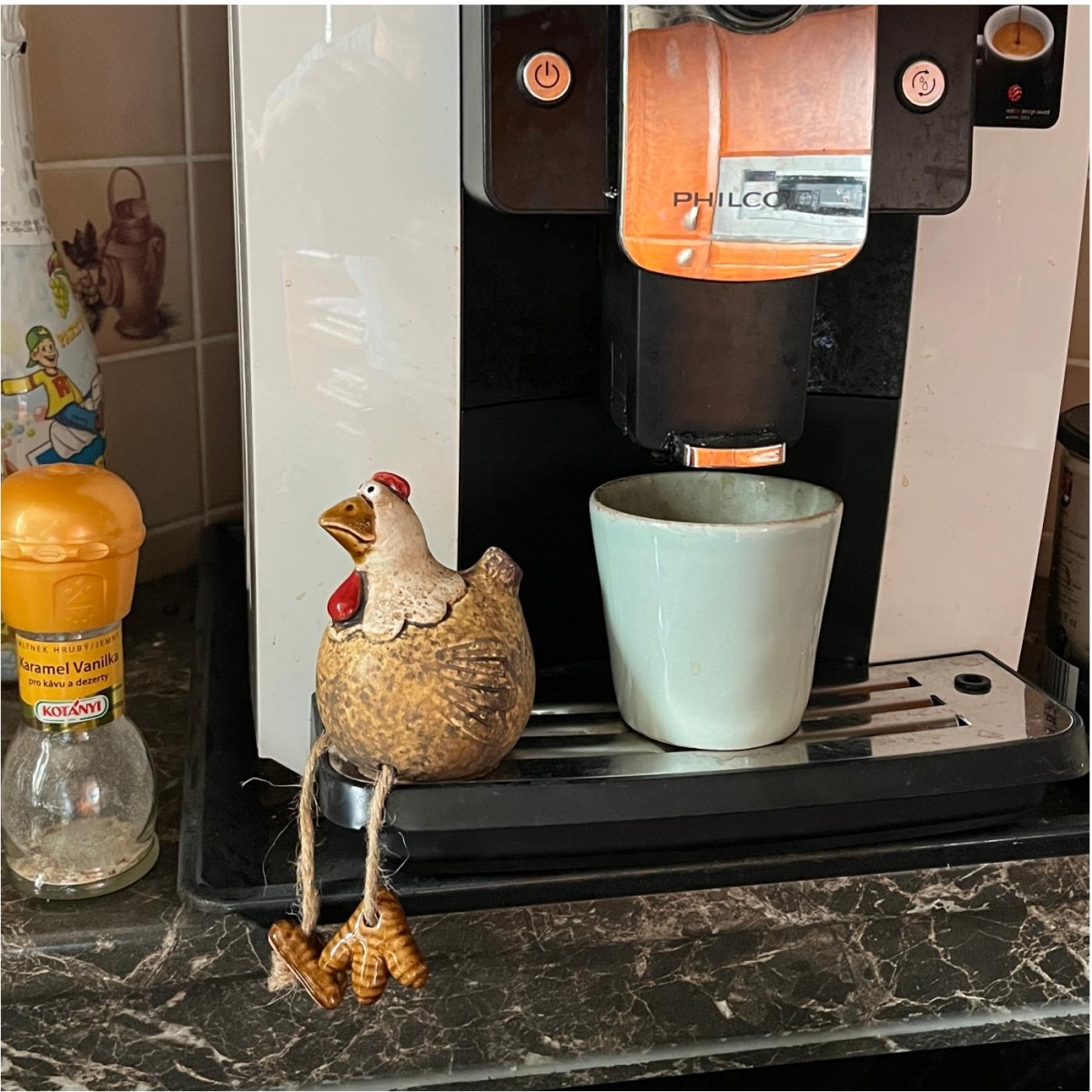 Její kouzlo spočívá právě v maličkosti. Volně visící nožky na jutovém provázku dodávají dekoraci lehkost, hravý výraz a dělají z ní něco víc než jen obyčejnou figurku. Slepička působí mile, nenuceně a přirozeně zapadne do interiéru, kde máte rádi keramické dekorace, kuchyňské doplňky a venkovský styl.
