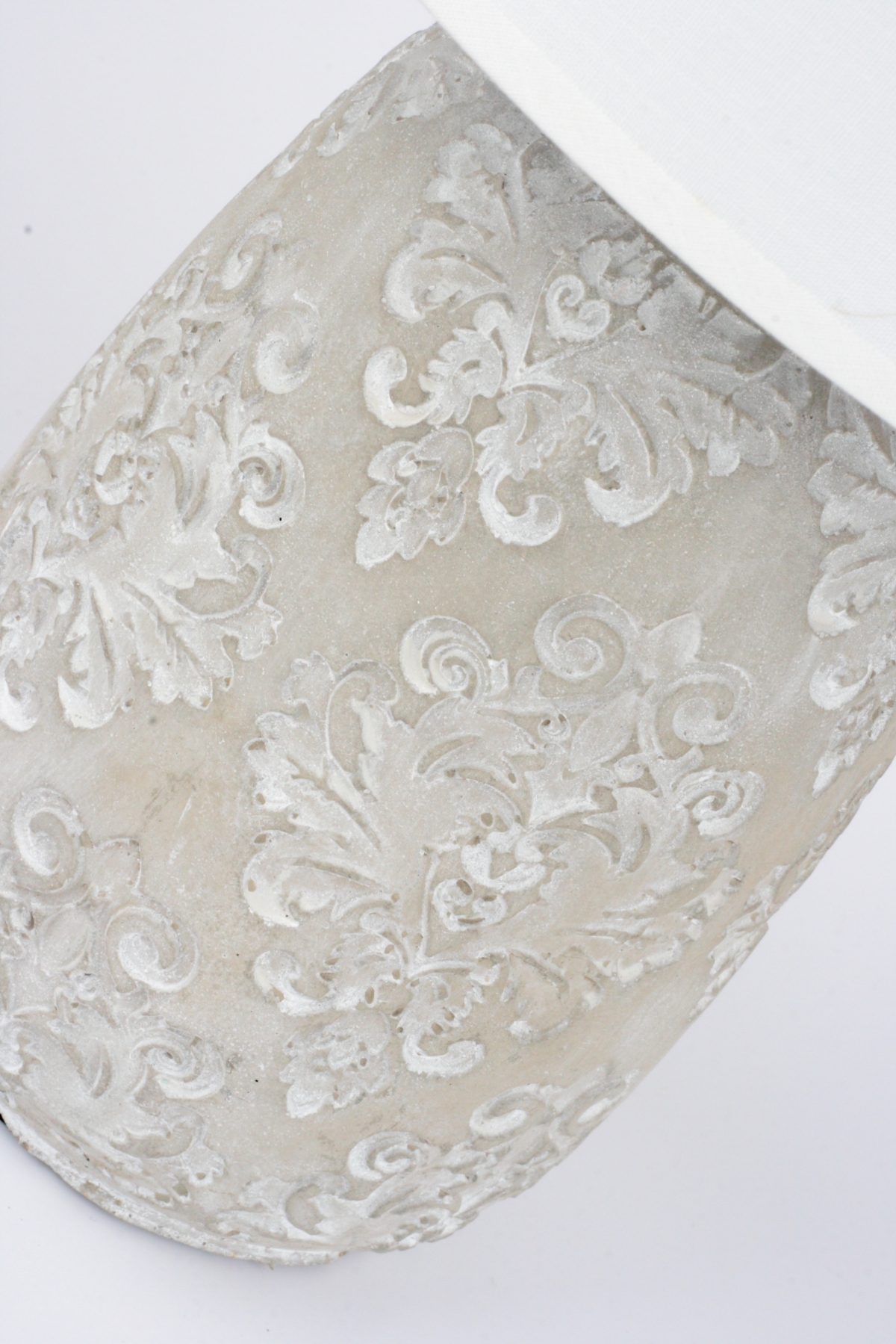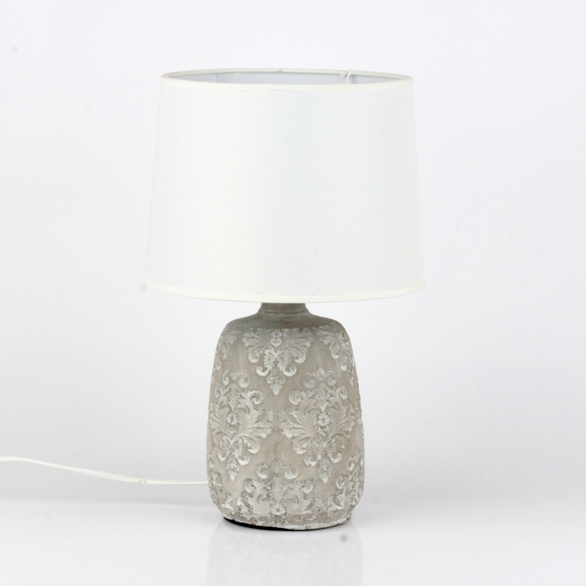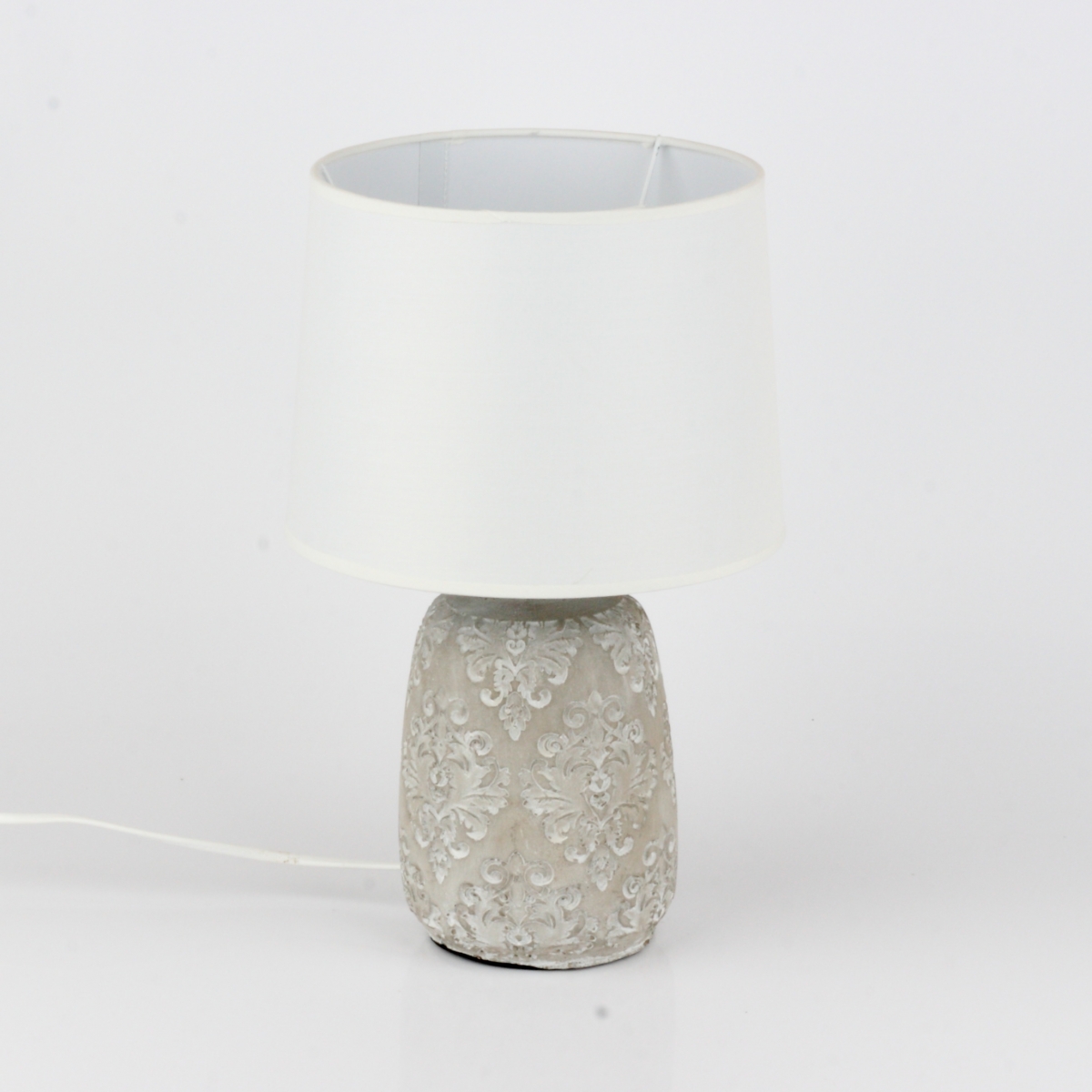 Keramický podstavec lampy má překrásný zámecký vzor. Jednoduché stínidlo mu dává příležitost ještě lépe vyniknout.