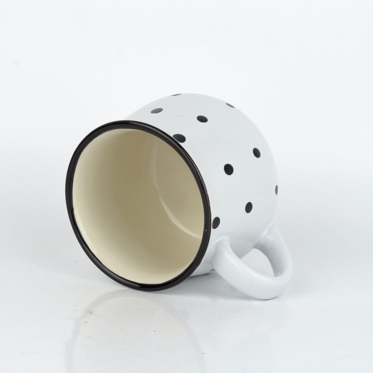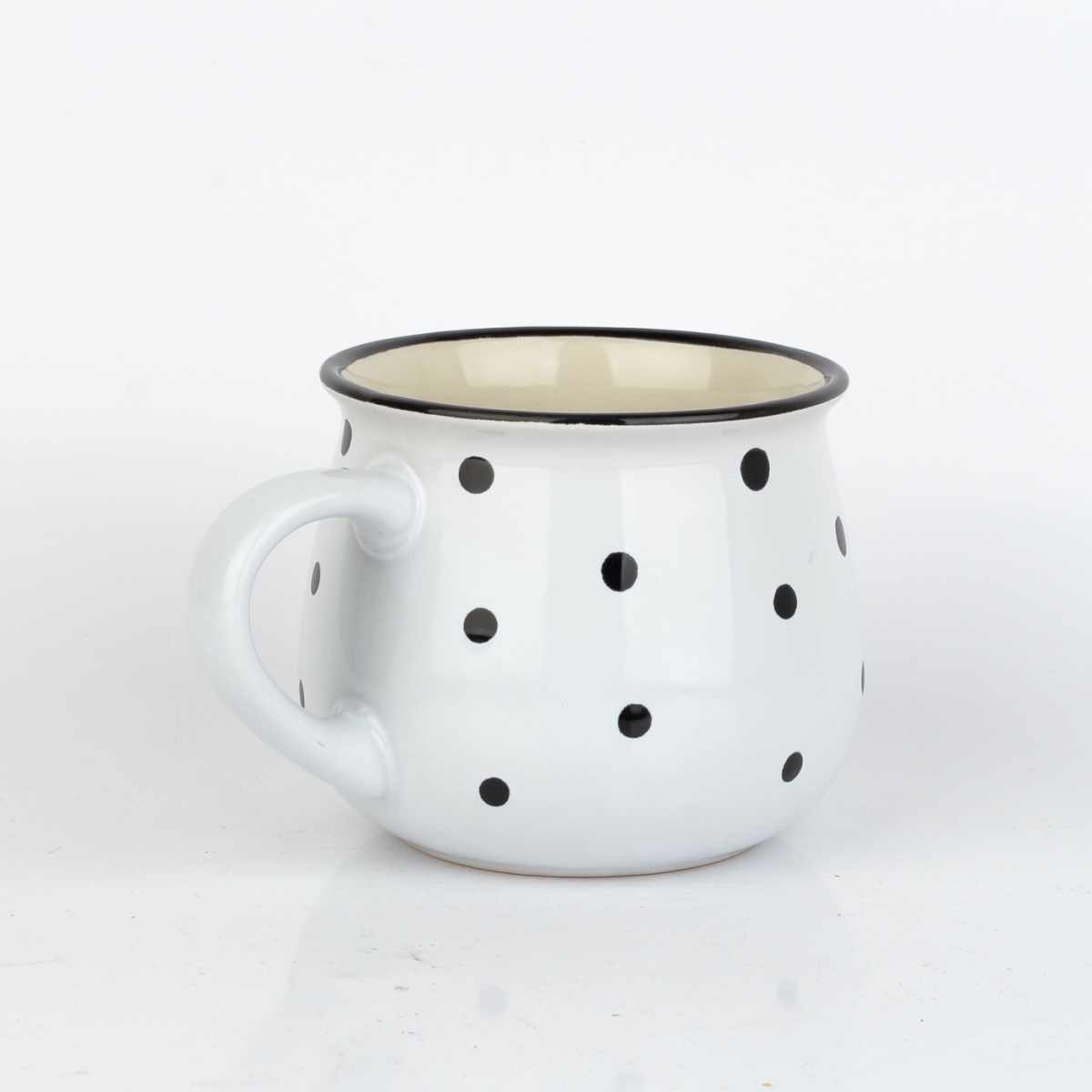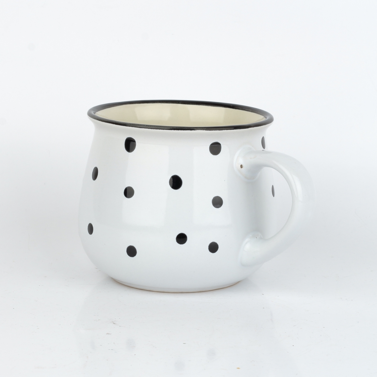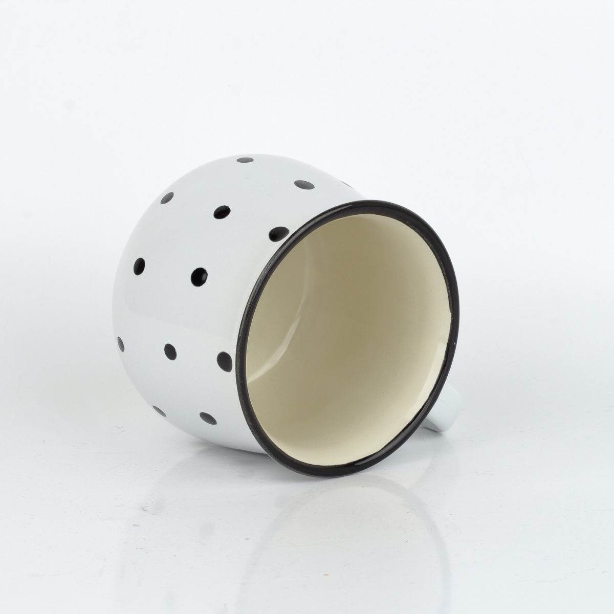 Malé černé puntíky na lesklé bílé glazuře, z něj dělají klasický příklad keramiky používané na venkovských chalupách. V každé kuchyni se bude krásně vyjímat. Díky velikosti tento keramický hrnek jistě využijete i jinak, než jen pouze na nápoje. Neztratí se jako pomocník při přípravě pokrmů, nebo netradiční váza zdobící váš prostřený stůl. Je samozřejmě vhodný i jako dárek.