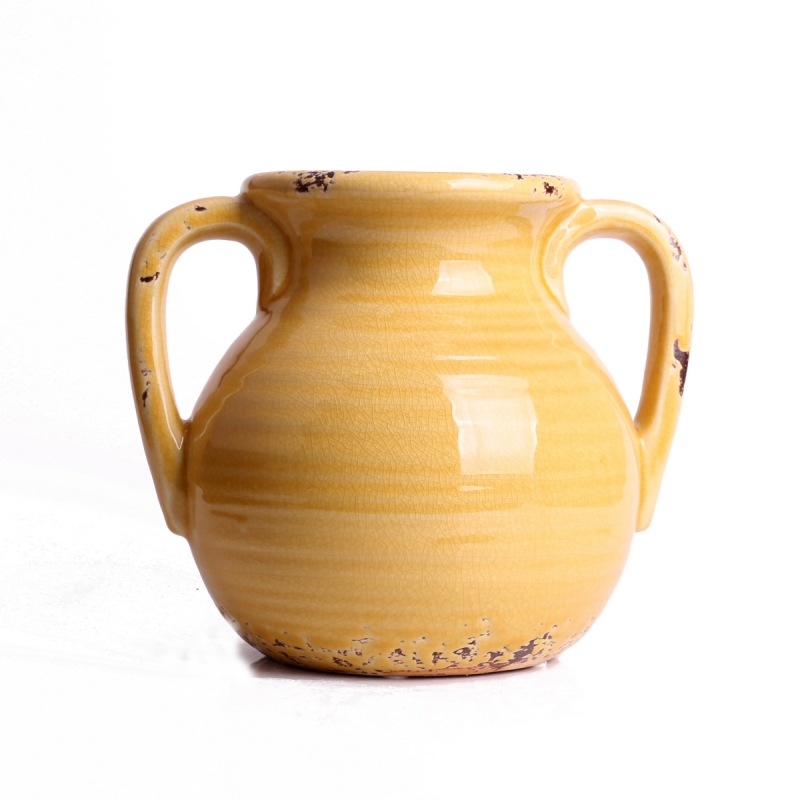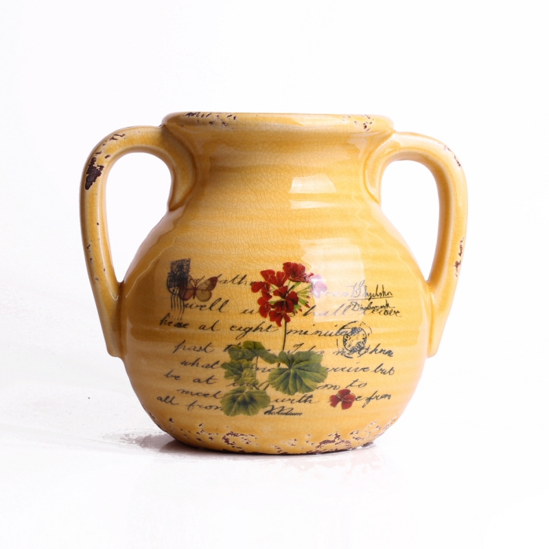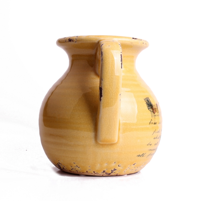 Květník má podobu antického džbánu s krásnou výraznou žlutou popraskanou galzurou, oprýskaným vzhledem, ozdobnými nápisy a motivem květin. Vše spolu krásně ladí a působí starobylým dojmem.