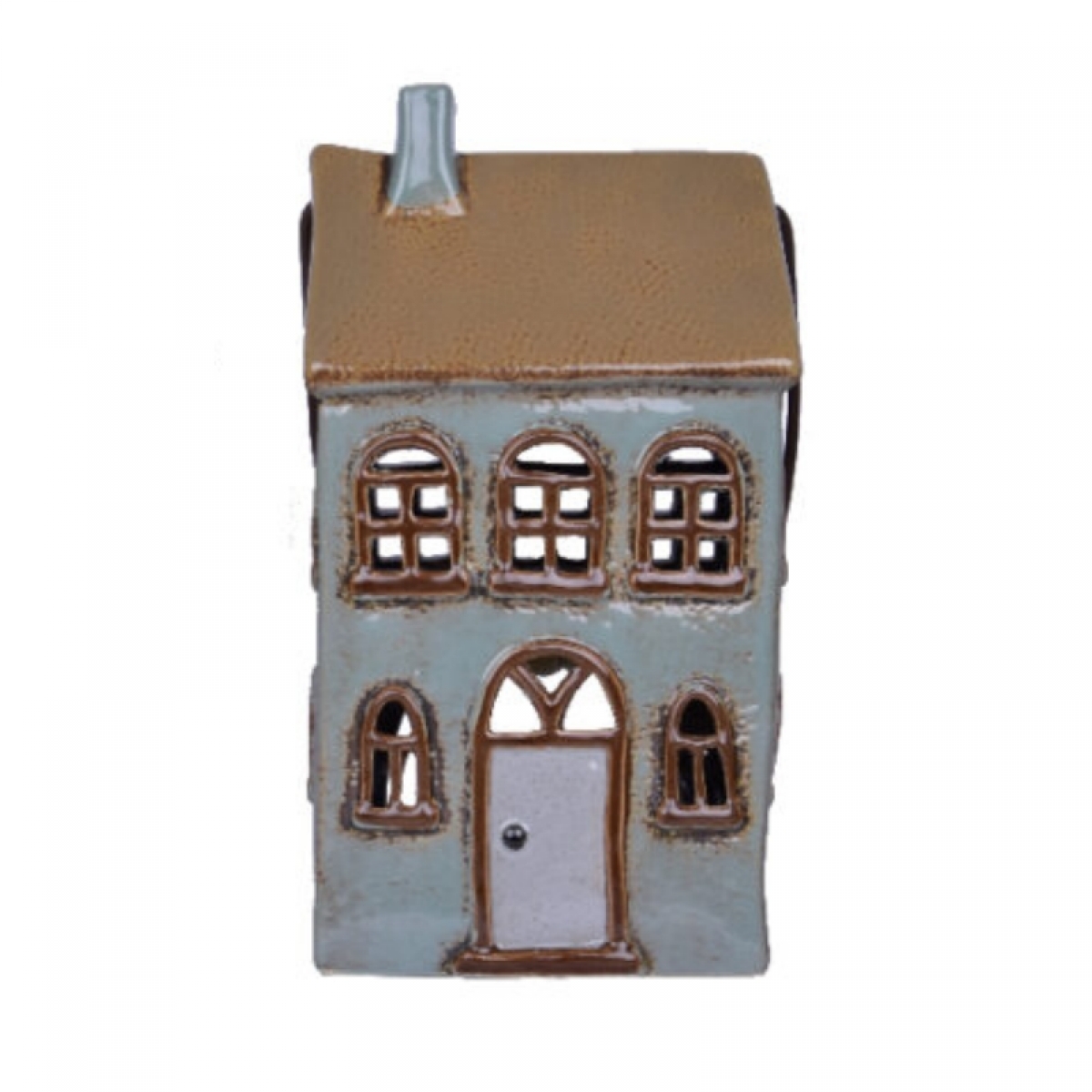Keramický svícen v podobě domečku s rukojetí v modré barvě