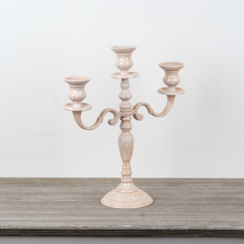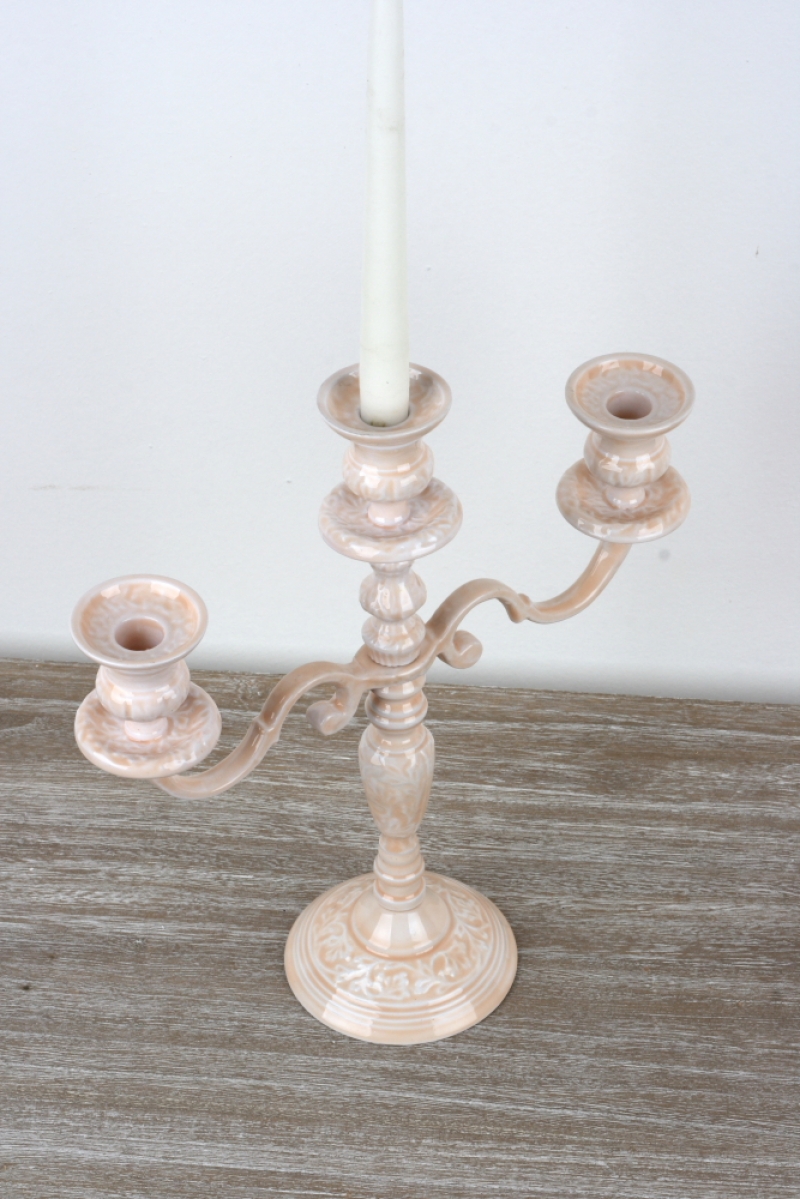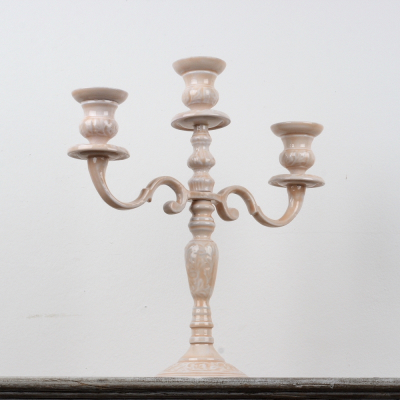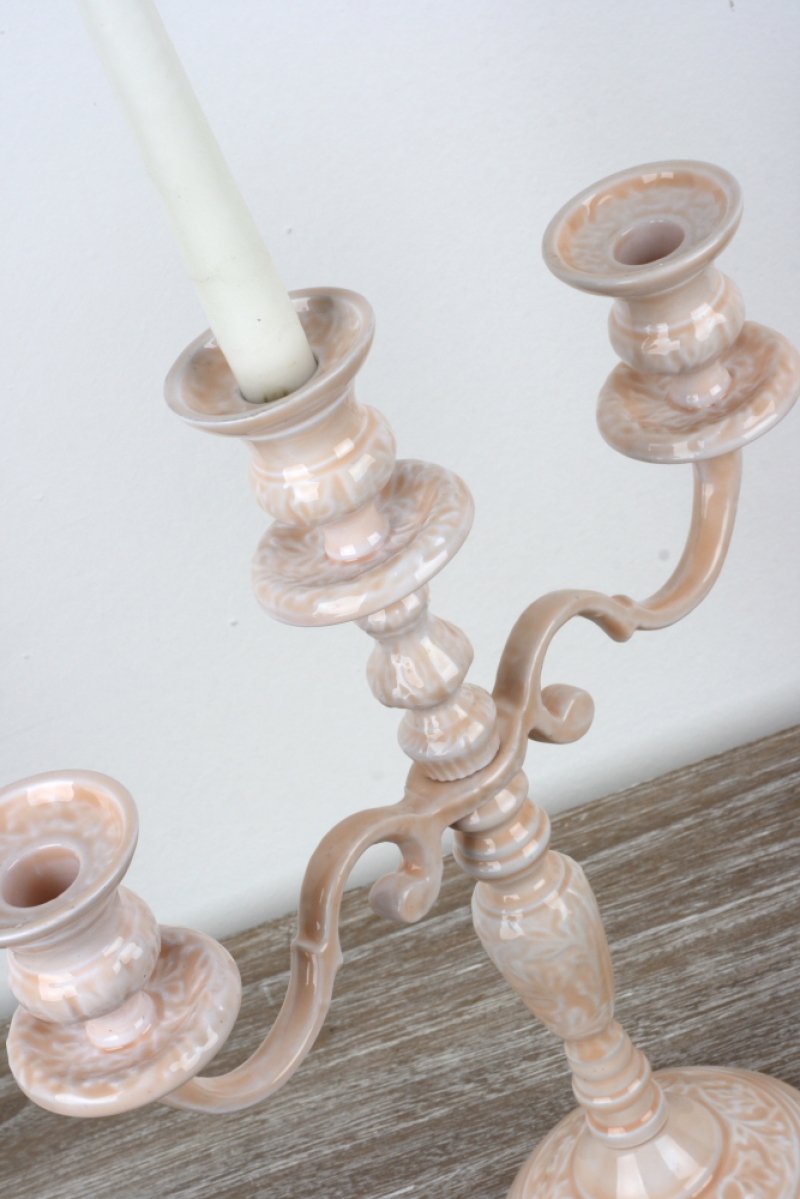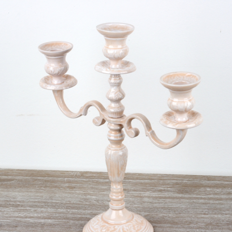 Keramický zdobený svícen na tři svíčky 36cm v decentní růžové barvě s květinovými vzory působí velmi romanticky.