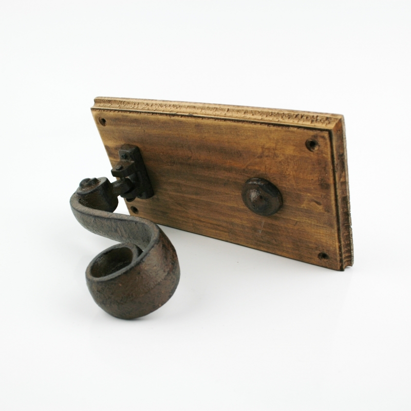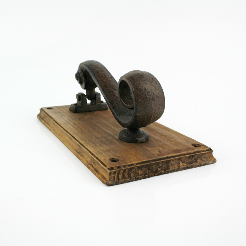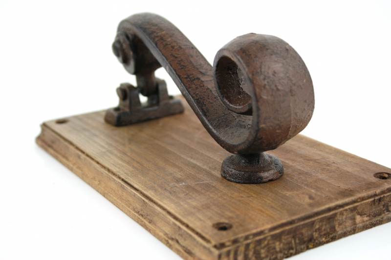 Litinové klepadlo hezky padne do ruky, je připevnění k dřevěné desce s otvory na připevnění k podložce.