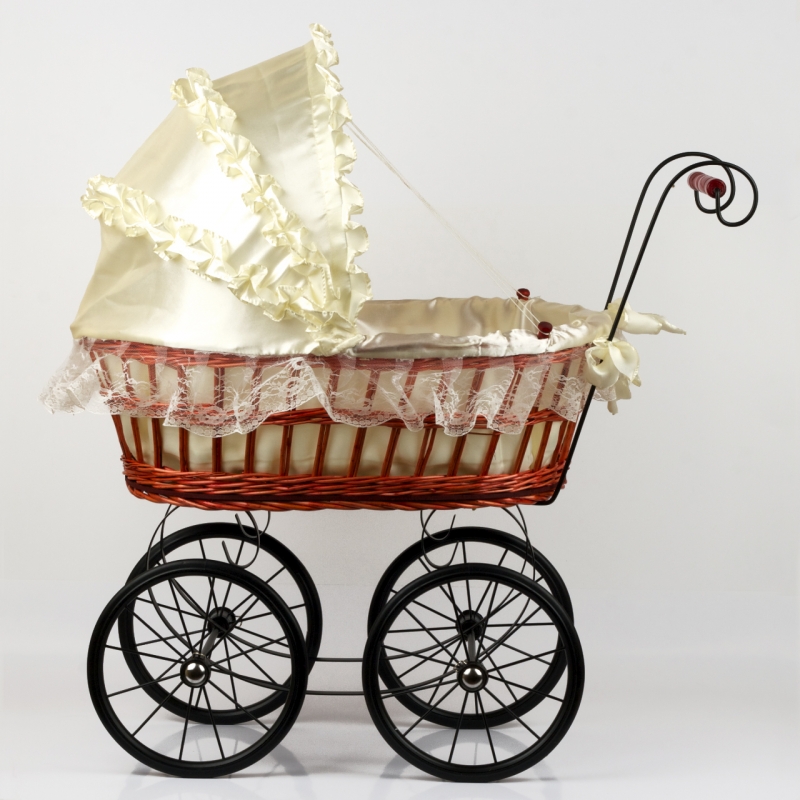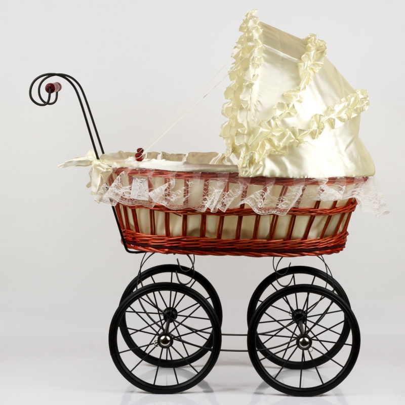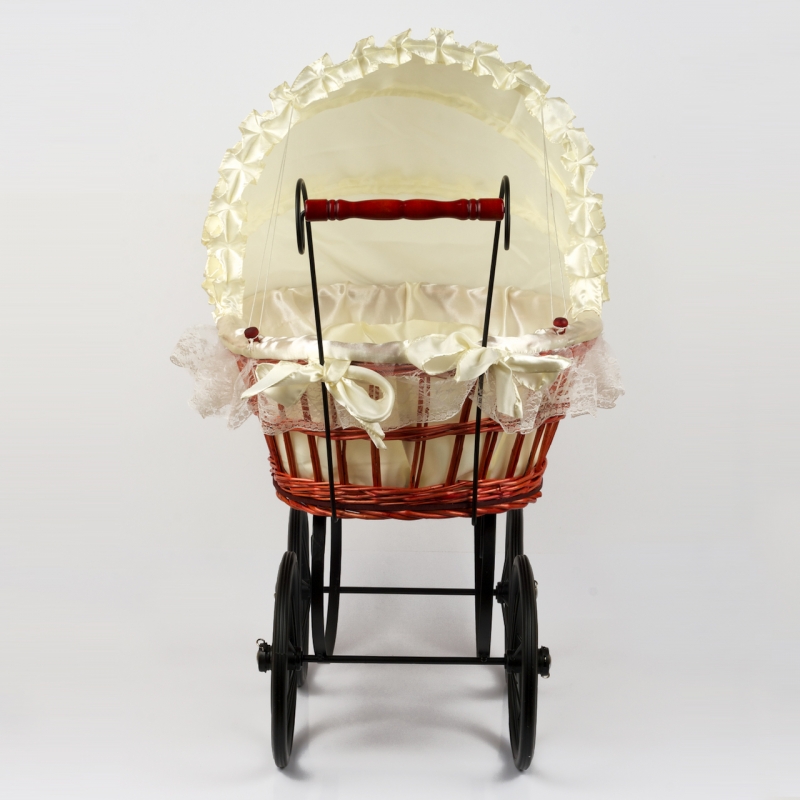 Materiál: proutí, krajka, bavlněný potah, dřevo, kov, pryž. Výška kočárku s boudičkou 76cm, se sklopenou boudičkou 50cm. Šířka korbičky 59cm. Řídítka dřevěné 18cm.
