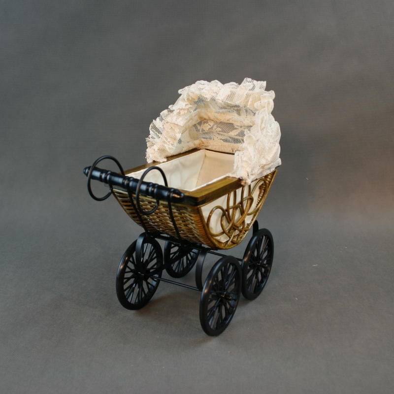 Kočárek pro panenku je zmenšená kopie reálného starodávného proutěného kočárku.
