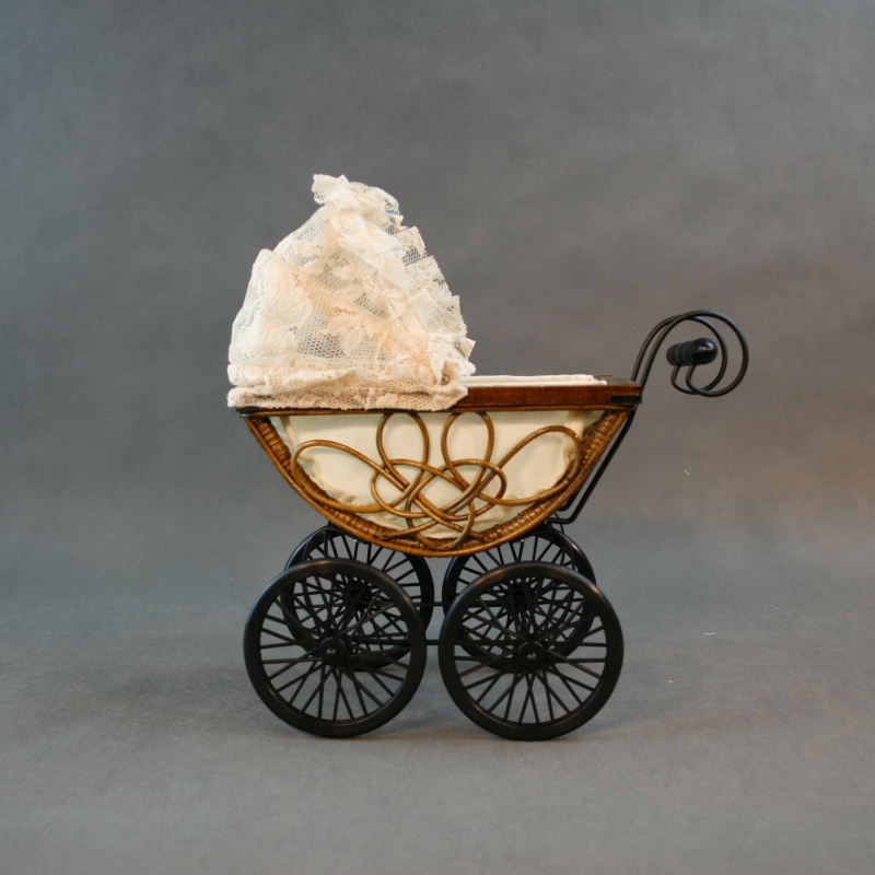 Materiál: látka, krajka, kov (rám kočárku), plast (kolečka), proutí.