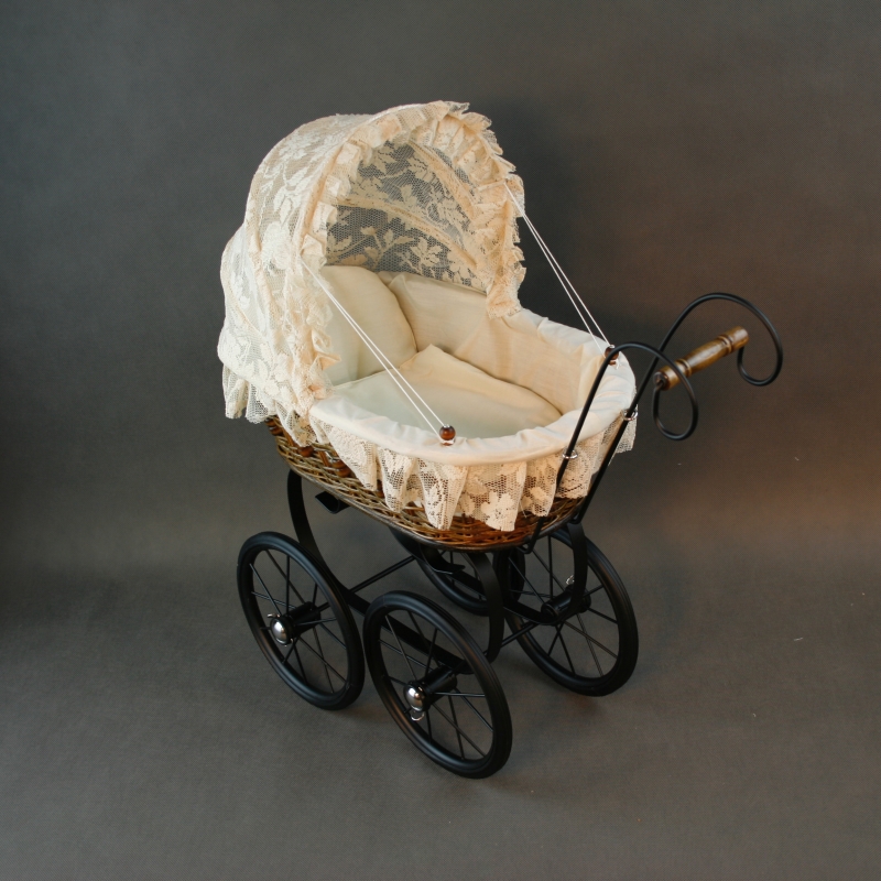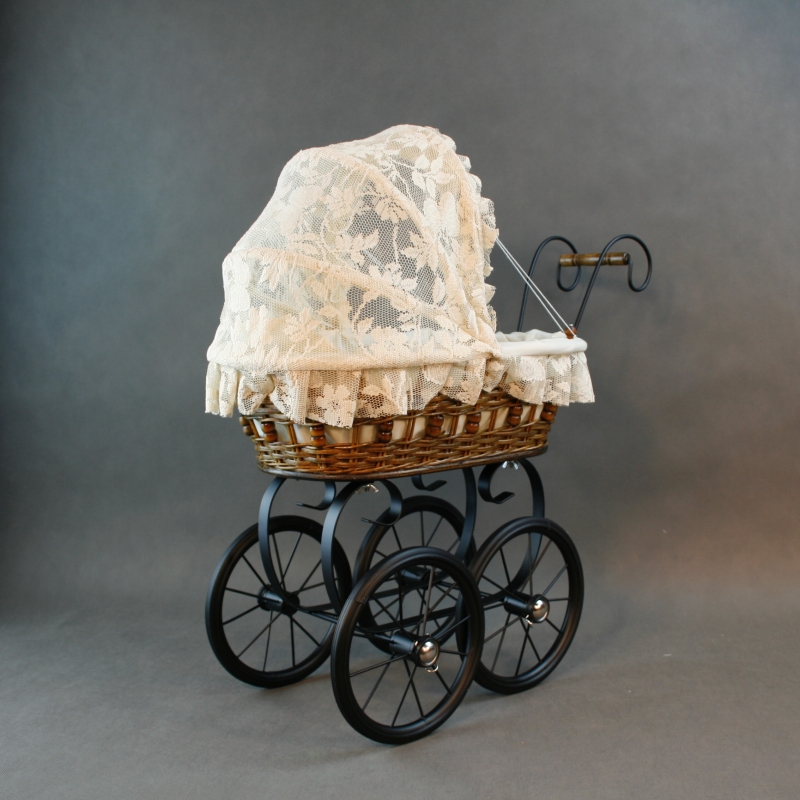 Kočárek pro panenky je kopie reálného starodávného proutěného kočárku.