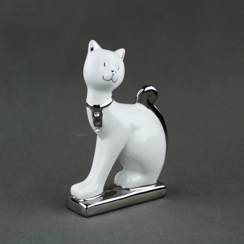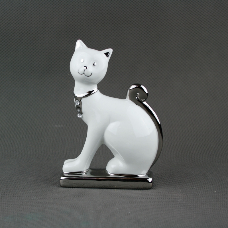 Kočka má bílé tělo se stříbrnými detaily (ocas, ouška, obojek). Podstavec na kterém kočka stojí je také ve stříbrné barvě. Ocásek má na pravé straně.