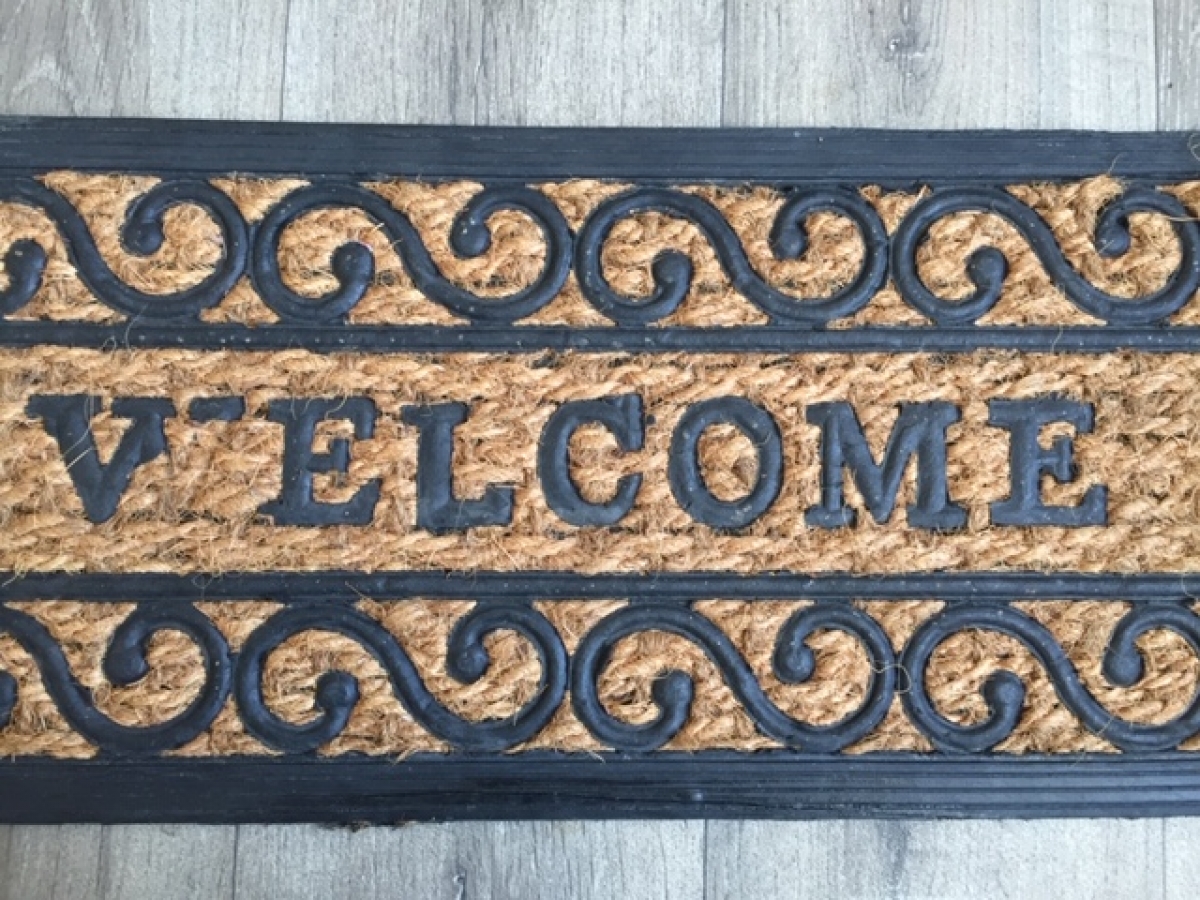Kokosová rohožka s nápisem Welcome je vyřazena z důvodu poškození gumy.