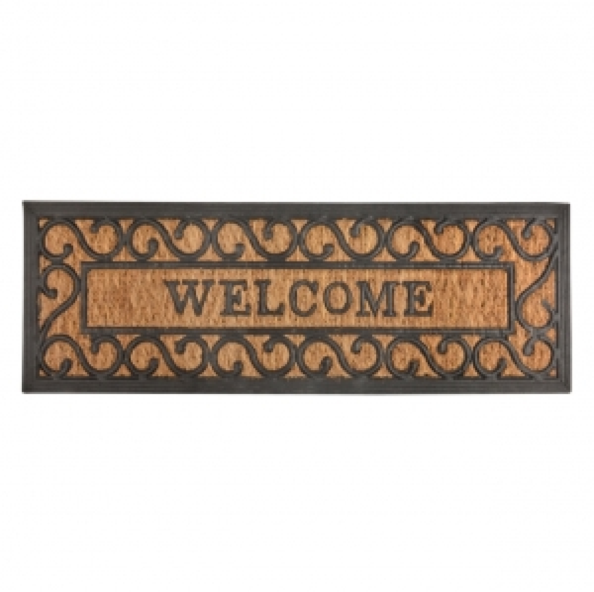 Kokosová rohožka s nápisem Welcome je vyřazena z důvodu poškození gumy na jednom z rožků.