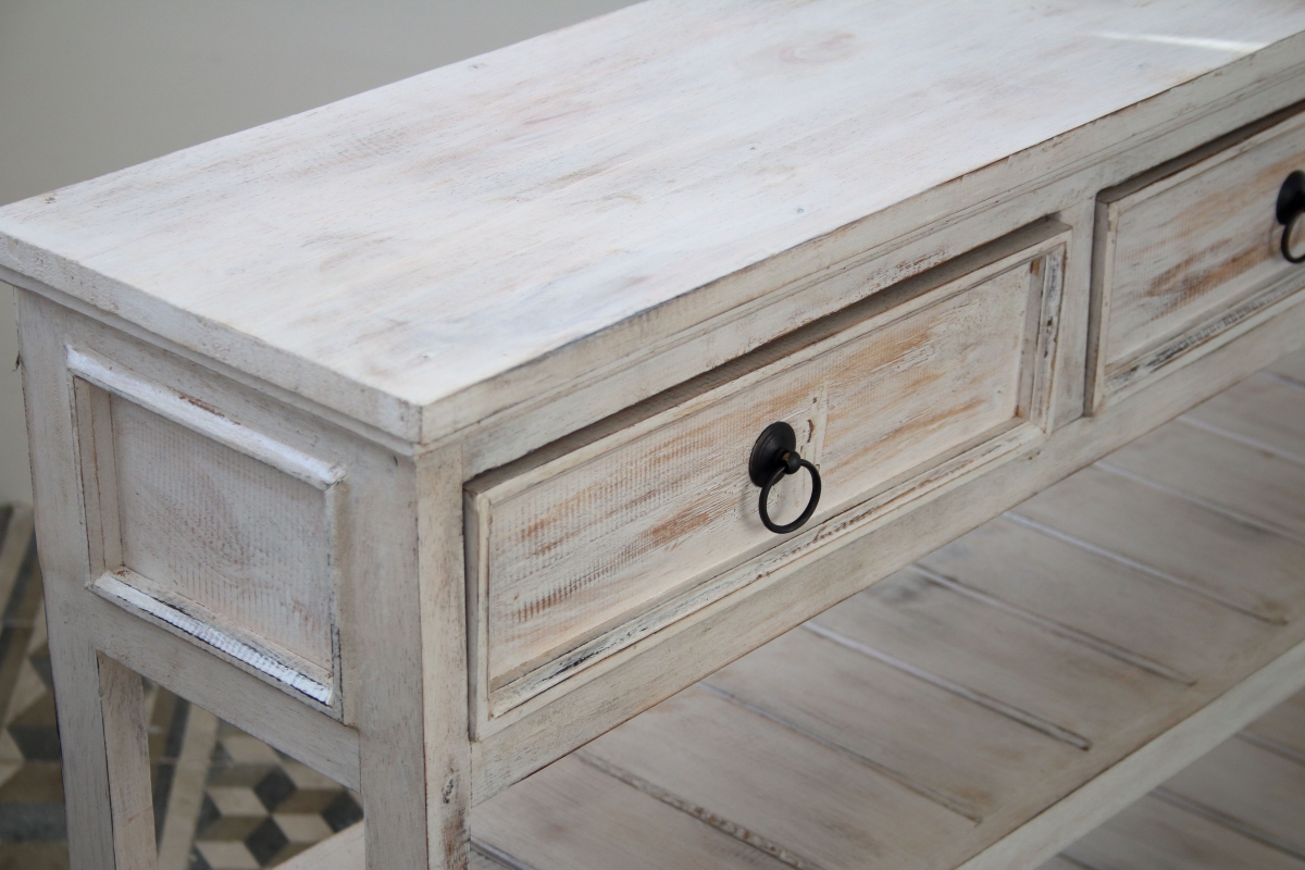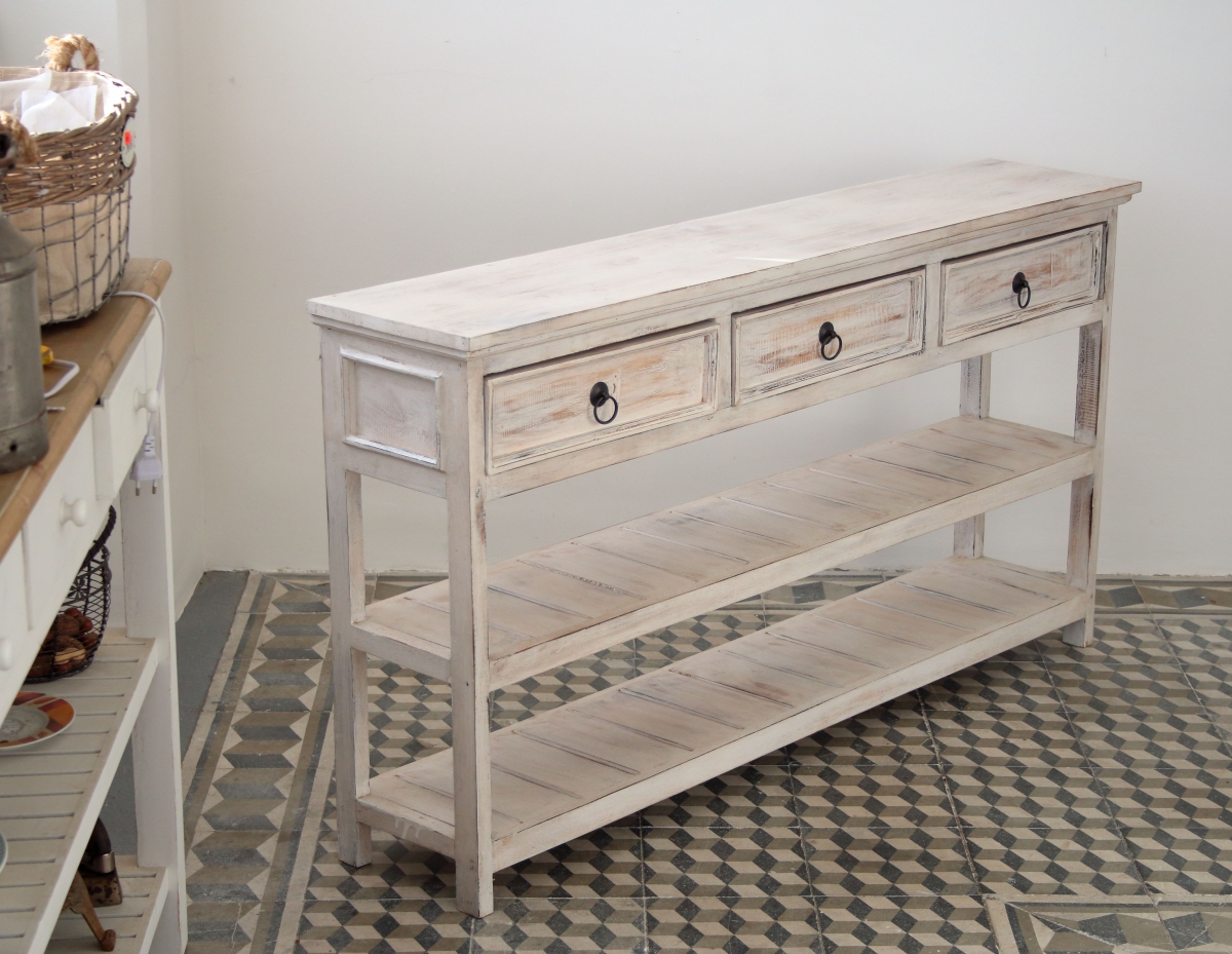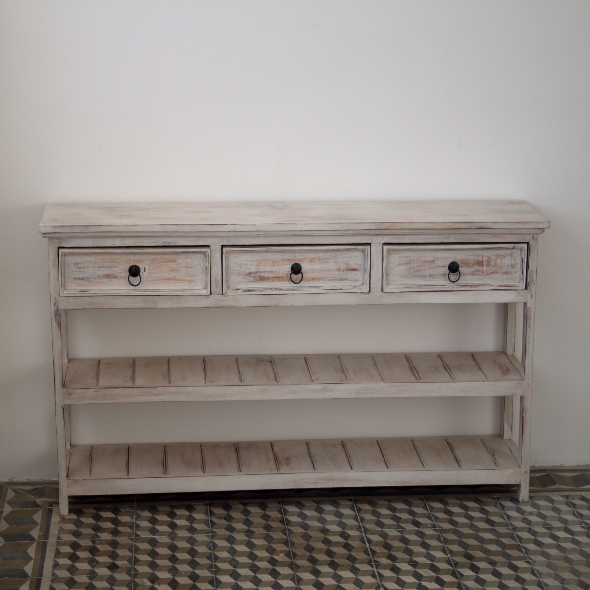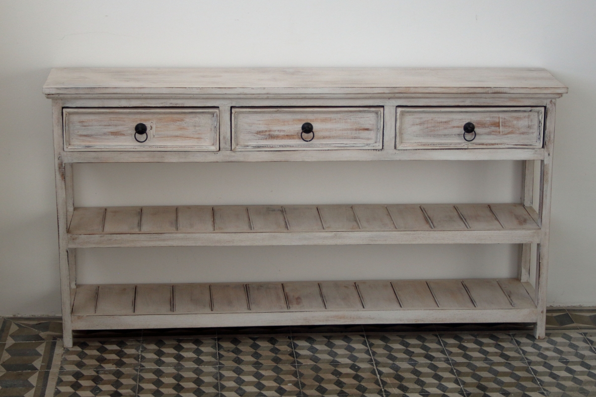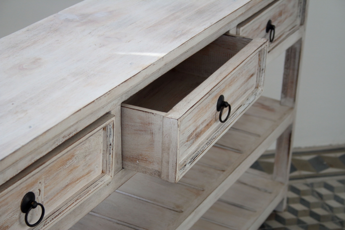 Stolek má dvě otevřené police a 3 šuplíky na drobnosti. Nabídne tak spoustu úložného prostoru i místo na dekorace. Dřevo s výraznou patinou je pro venkovský styl typické, proto ve stejném designu najdete v nabídce kategorie Nábytek spoustu dalších krásných kousků.