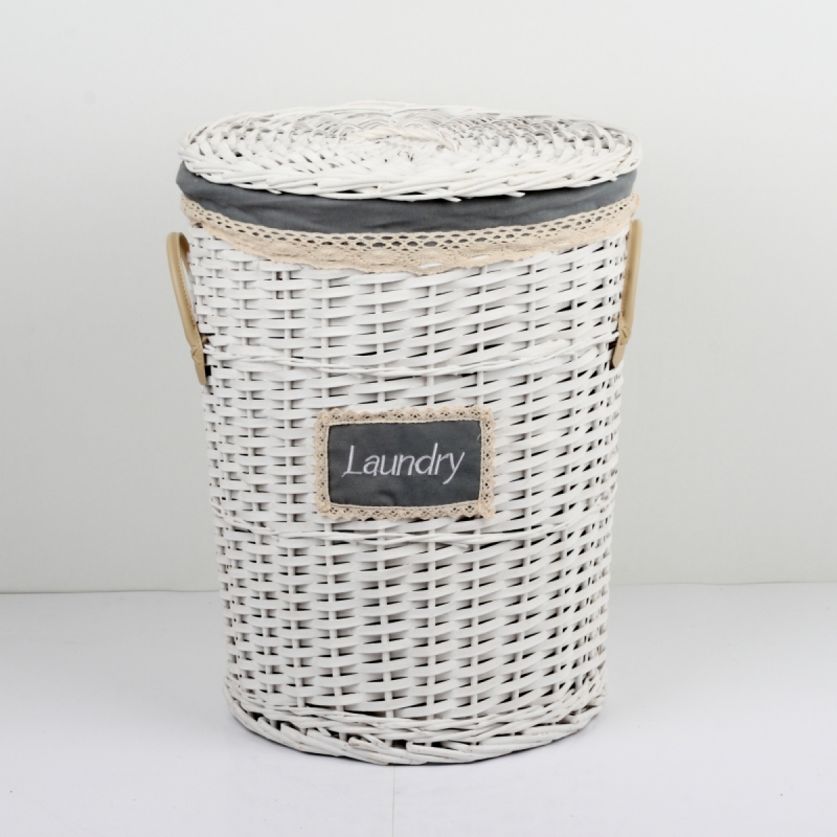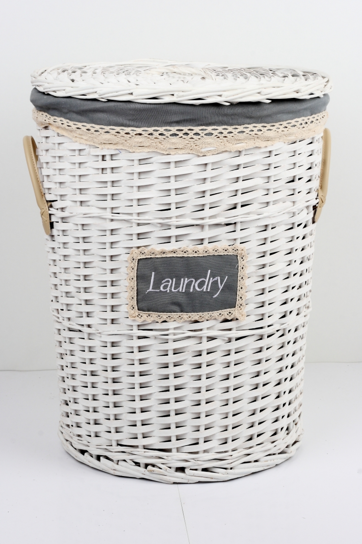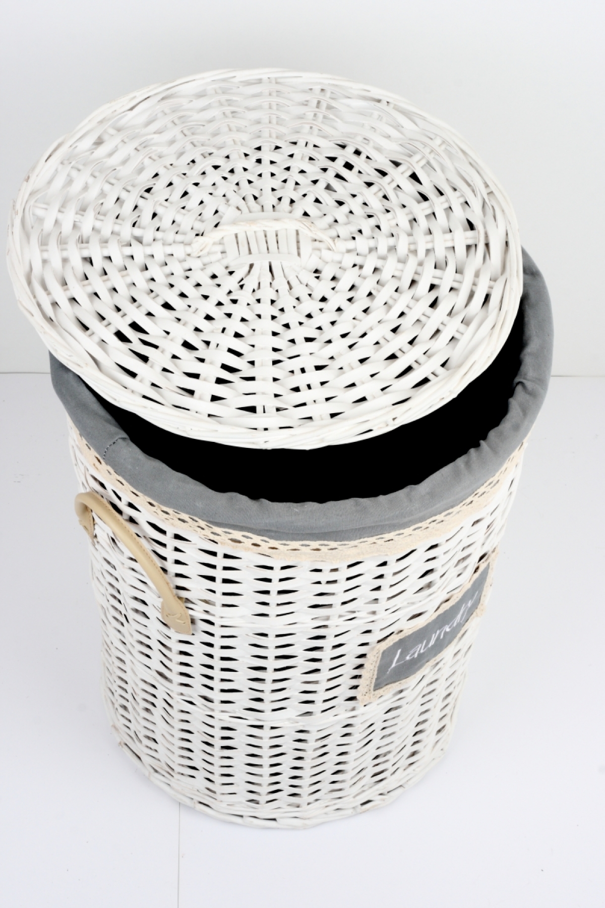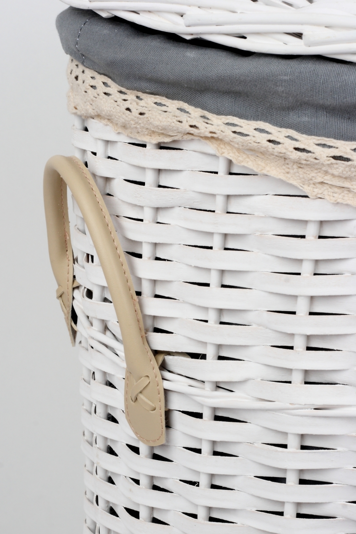 Bílý proutěný koš na prádlo s koženými poutky a krajkovou stuhou.