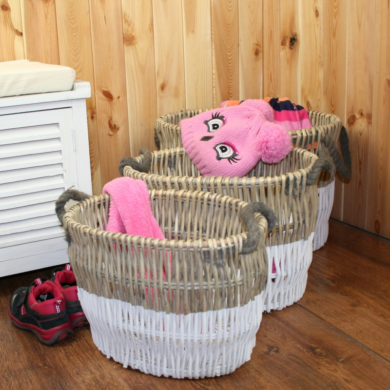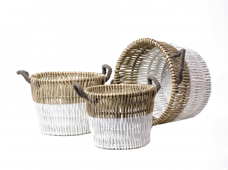 Košík proutěný s pevnými uchy z hnědého provazu. Košík je velmi netradiční kombinací přírodní barvy proutí a bíle natřené spodní části koše.