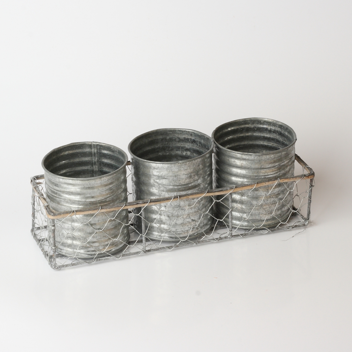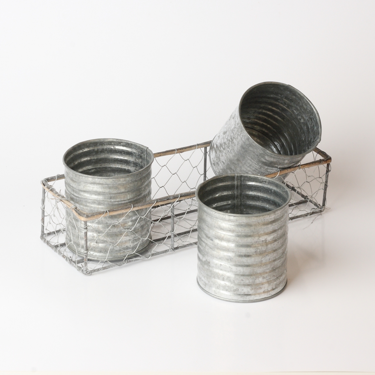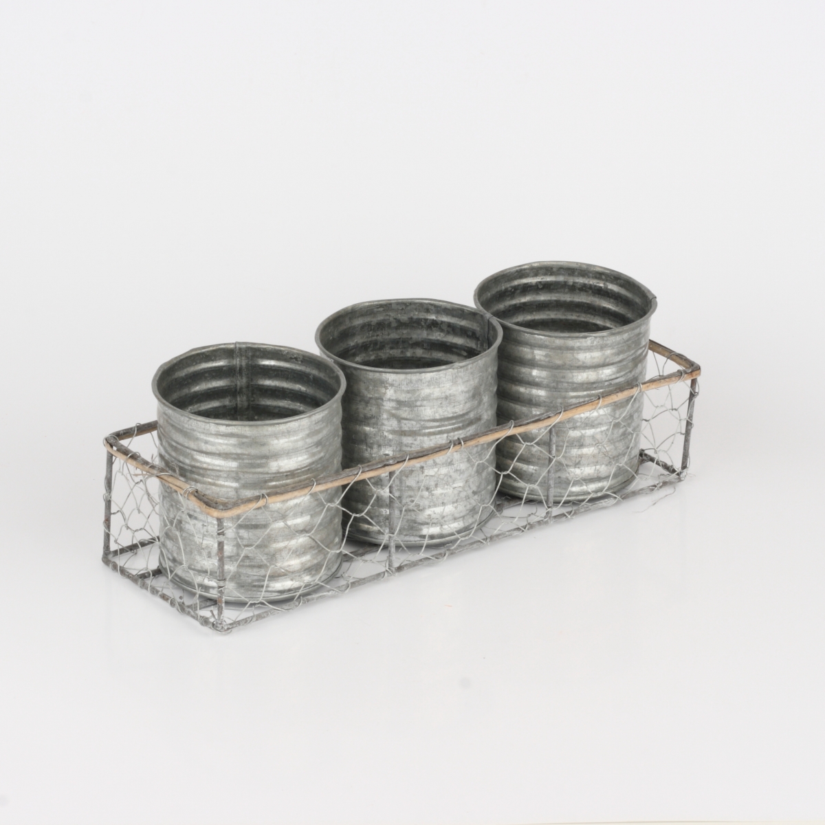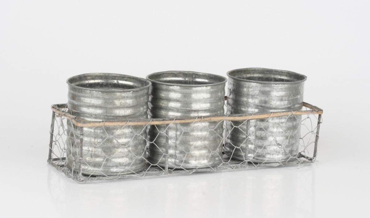 Košík s kovovým výpletem má tři plechové dózy, které můžete využít třeba jako květináče na bylinky, originální příborník nebo na stole na psací potřeby.