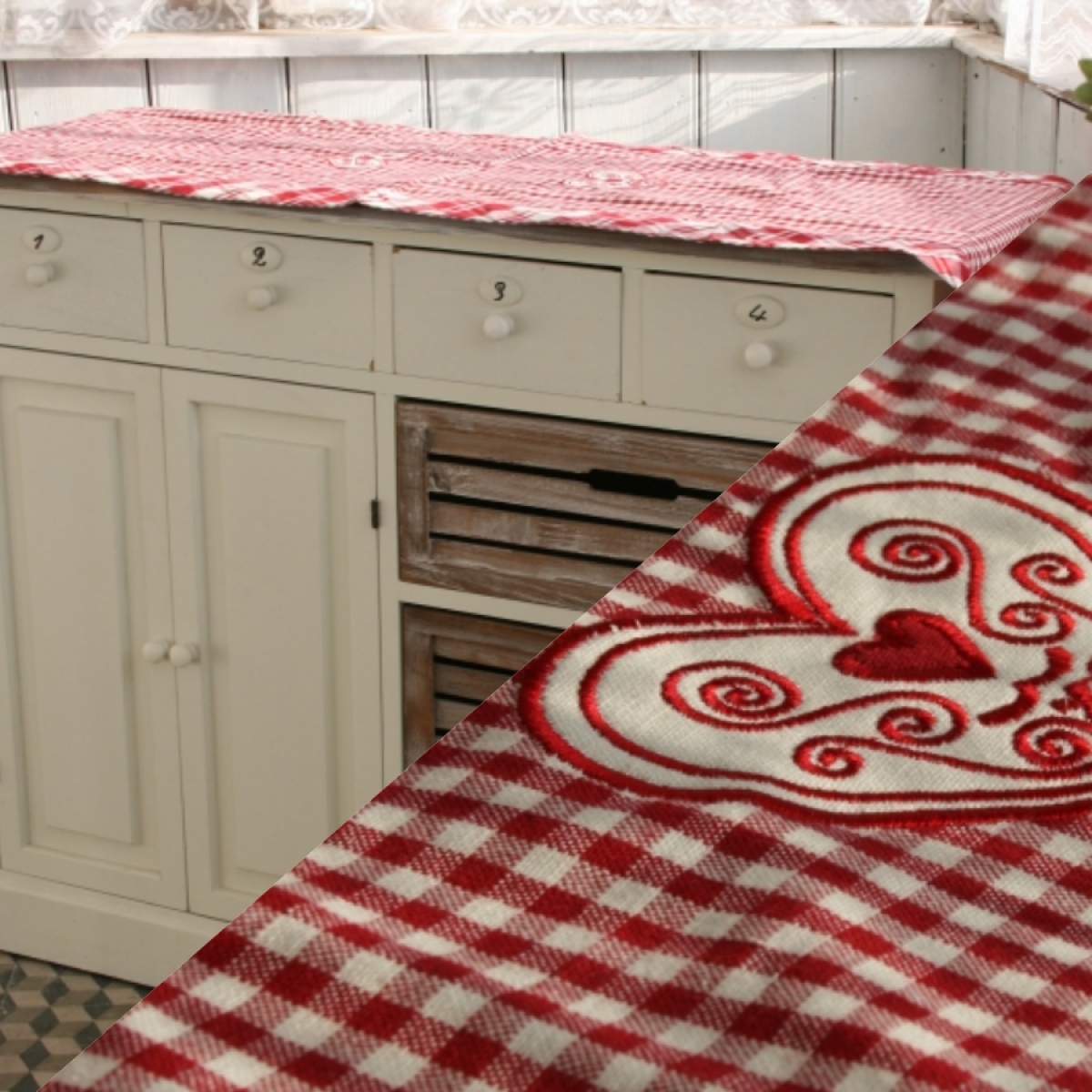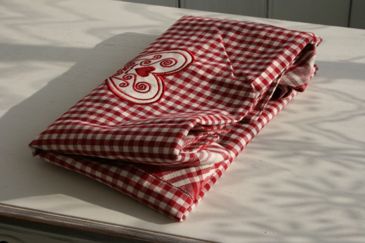 Ubrus s výšivkou ve tvaru srdce bude krásně vypadat v kombinaci s přírodním dřevem nebo například s bílou barvou. V nabídce je také další zboží ve stejném designu.