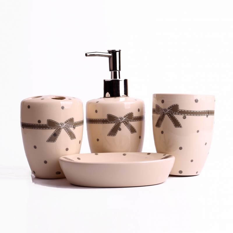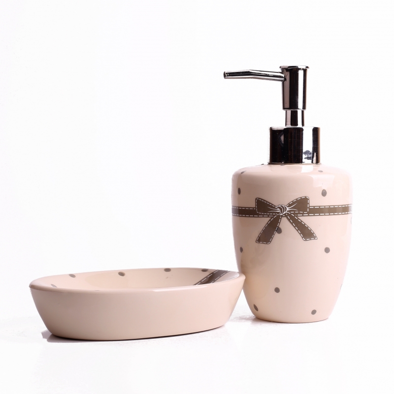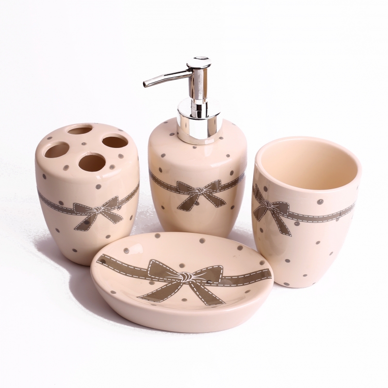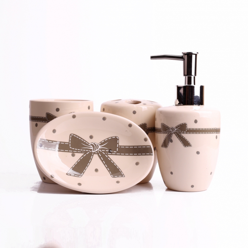 Keramická sada v neutrálních barvách potěší milovníky puntíků. Ty zdobí každý jednotlivý kus a navíc je sada doplněna o motiv velké mašle.