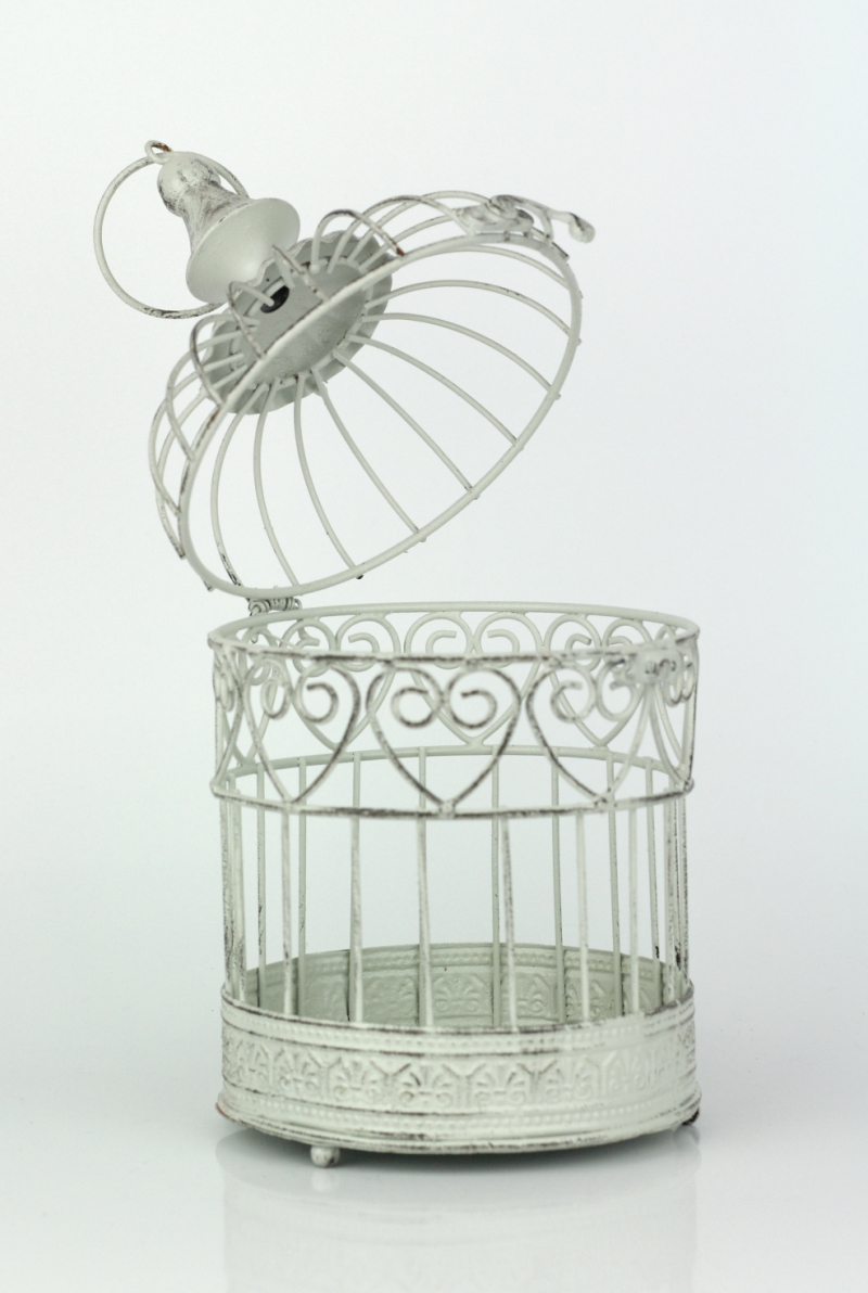 Svatební dekorace - Kovová klec v bílé barvě s patinou má odklopné víko, klec lze také zavěsit za kovový kroužek v horní části.