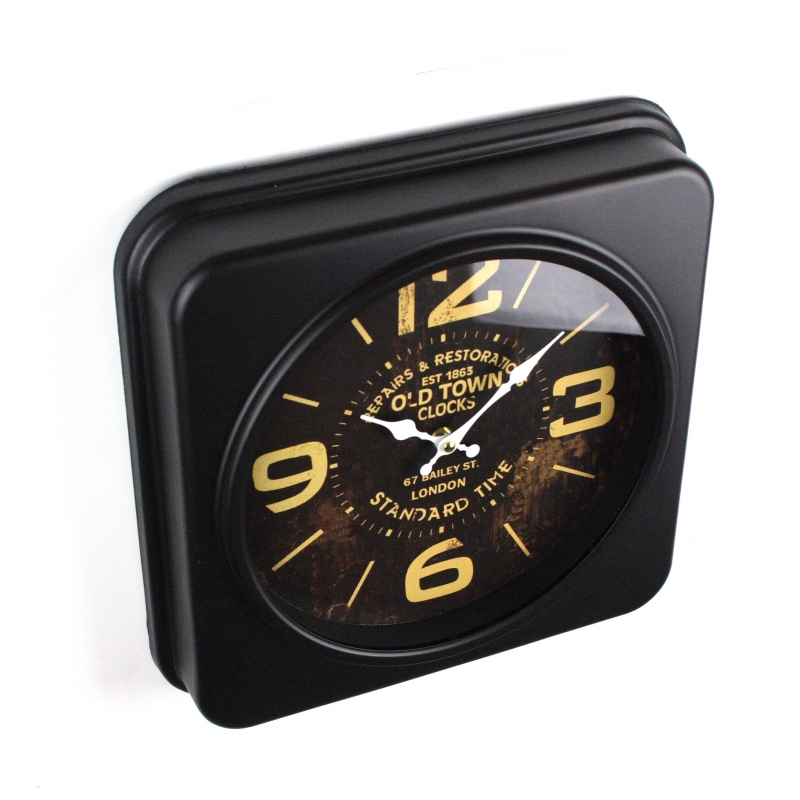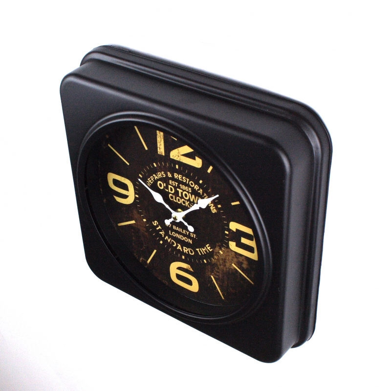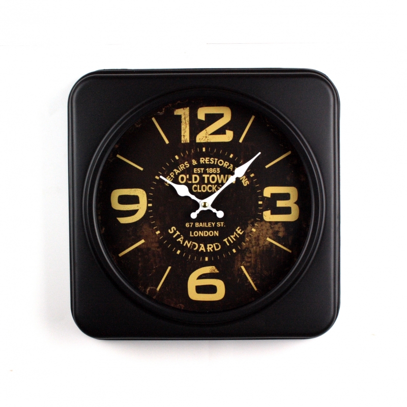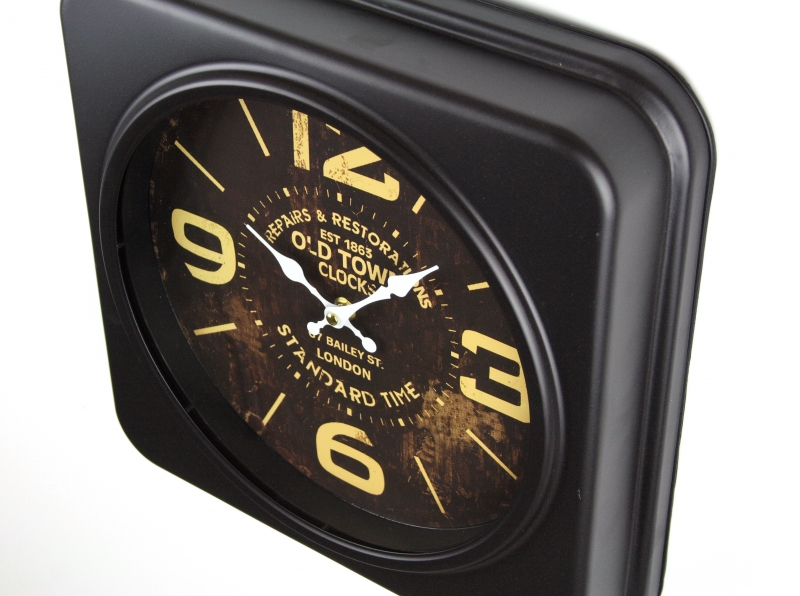Nástěnné hodiny ve tvaru čtverce v temných barvách s velkými číslicemi.