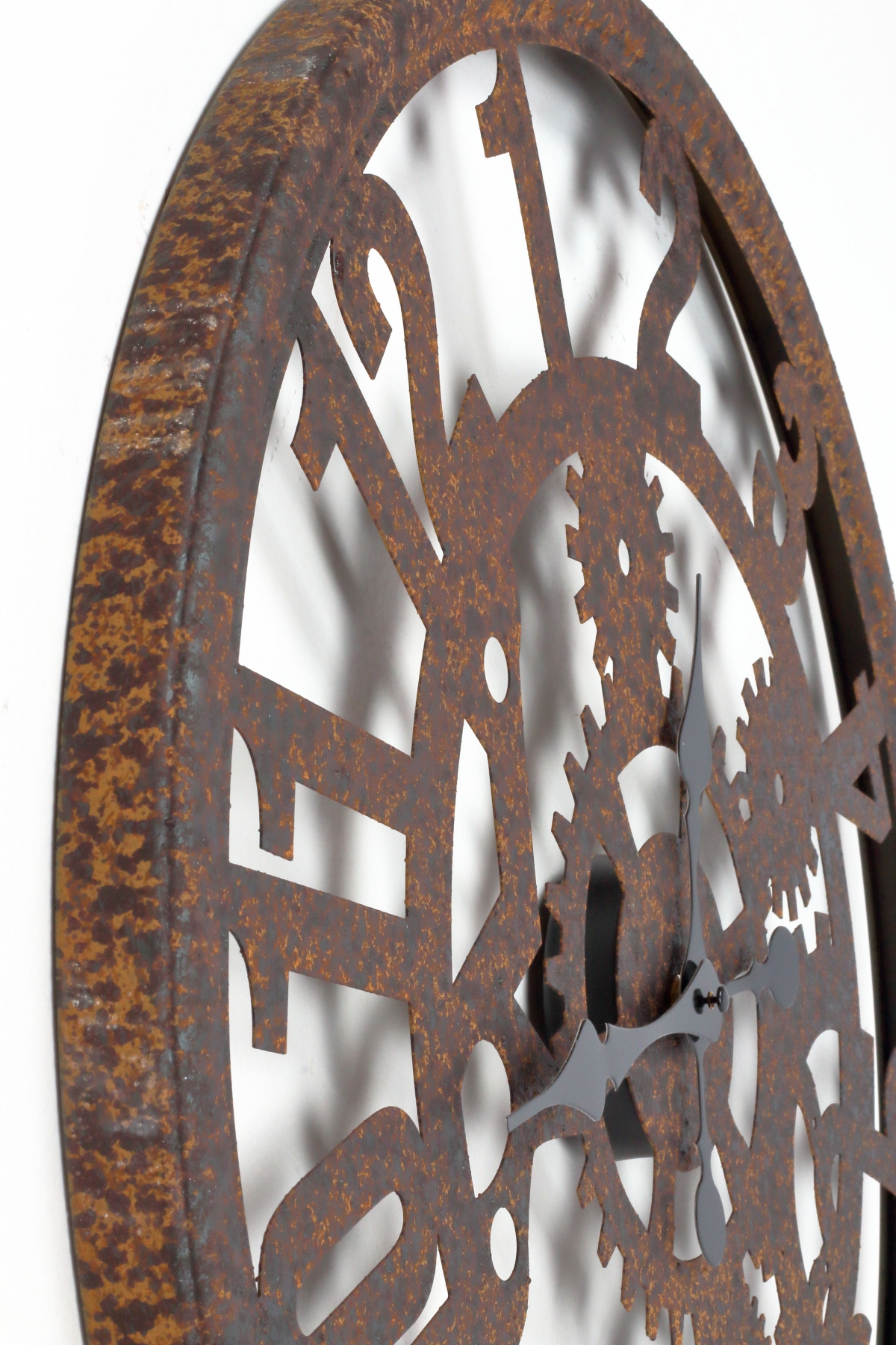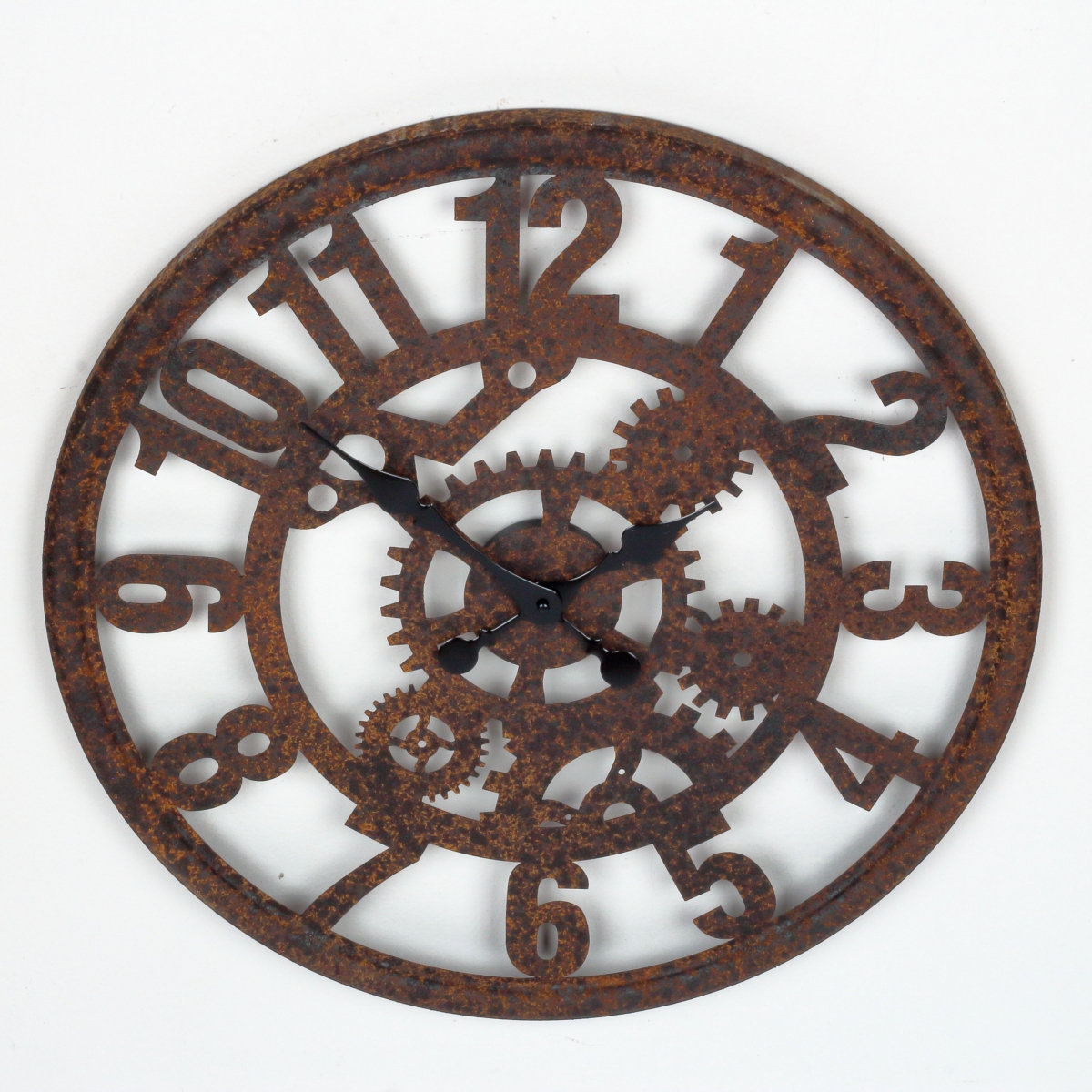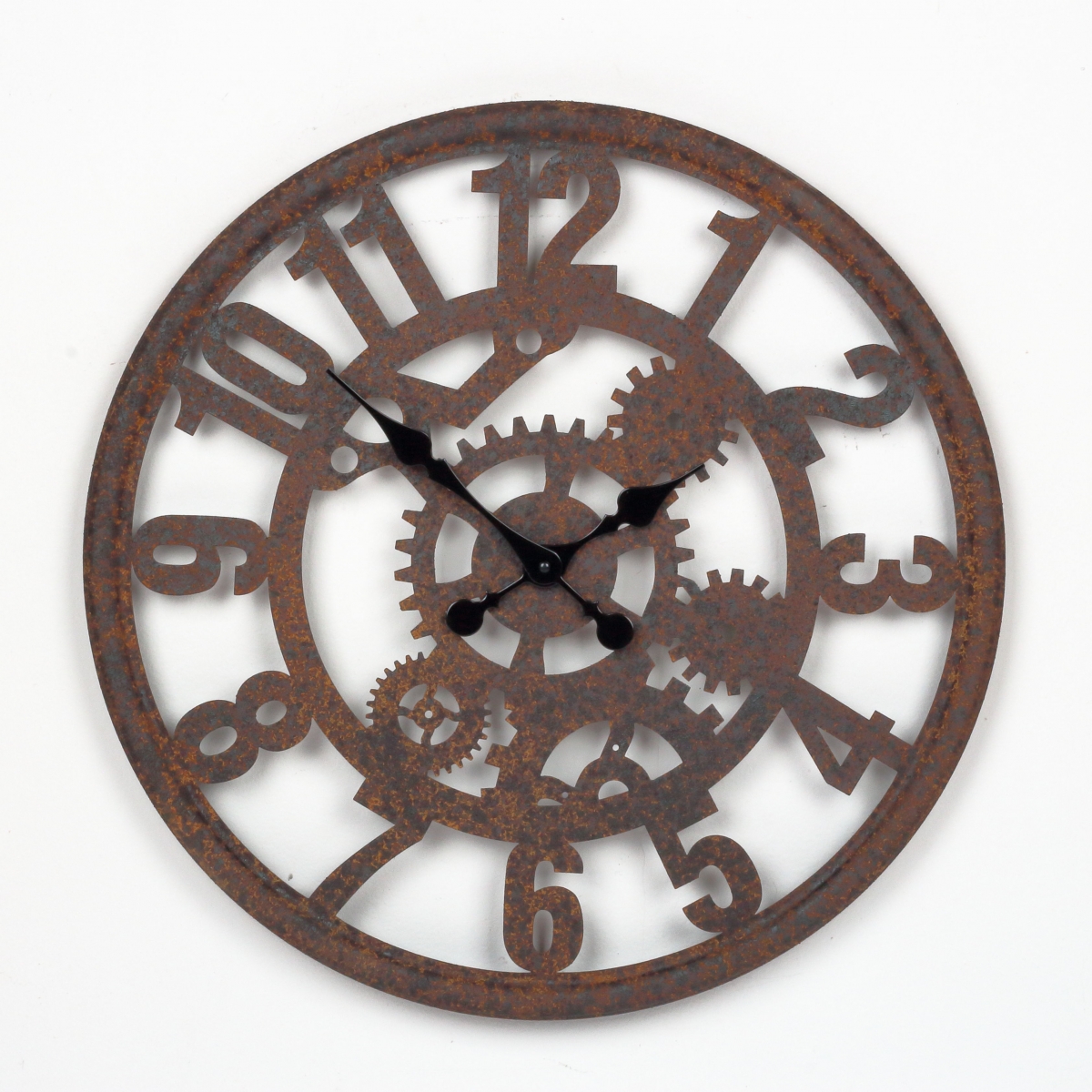 Kovové industrální nástěnné hodiny 58cm s výraznou imitací rzi působí, jakoby byly právě nalezené na staré půdě. A to na nich milujeme!