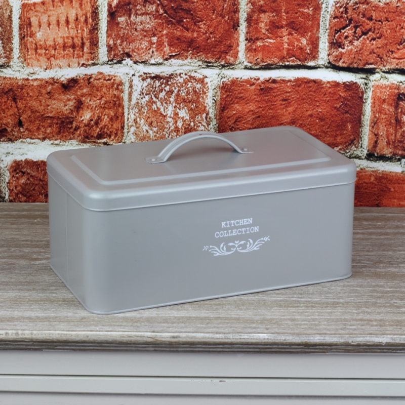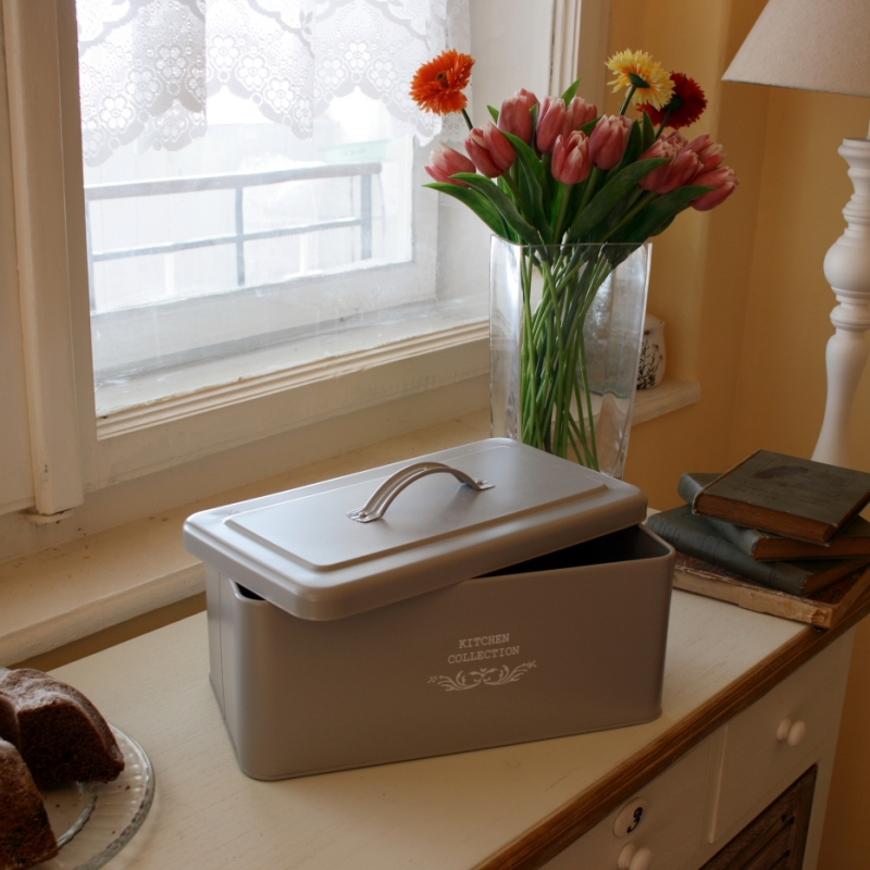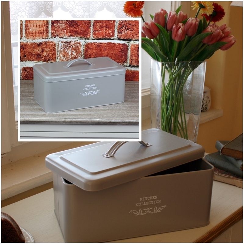 Chlebník je plechový, má praktický úchyt na víku a má krásnou šedivou barvu. Šedá barva je velmi univerzální a nemusíte se tak bát, že by Vám chlebník v inteiréru "neladil".