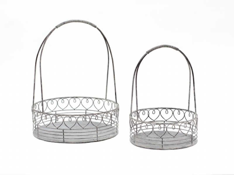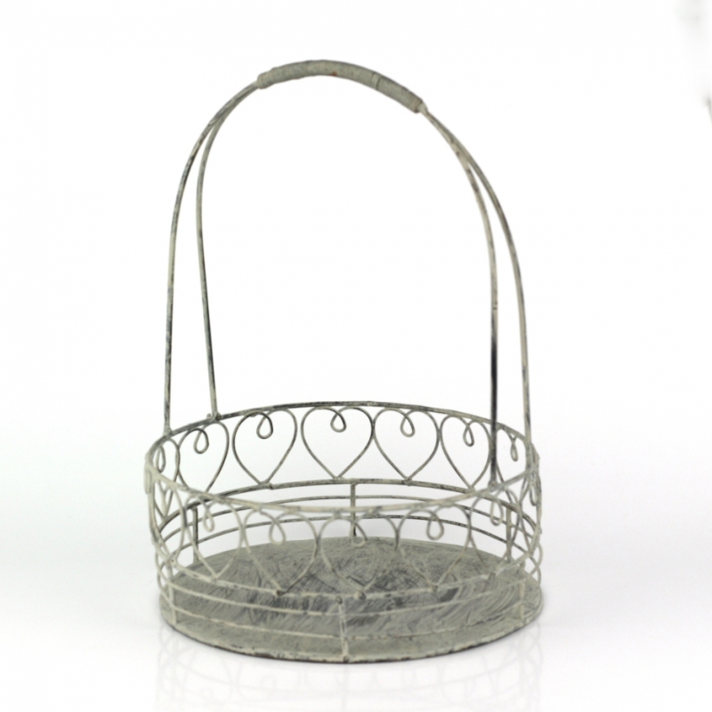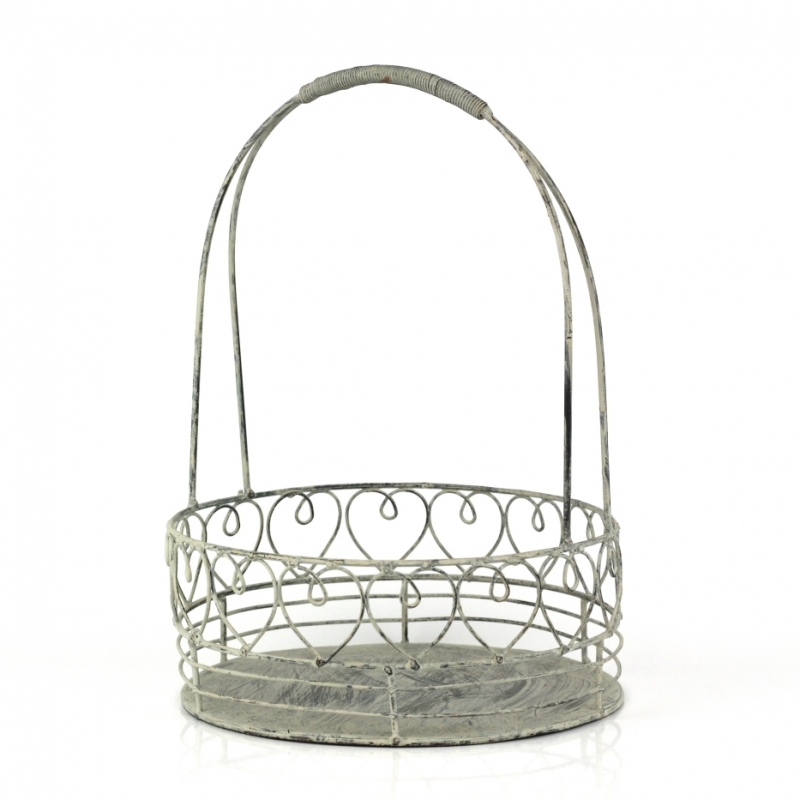Košík je z pevného kovu s patinou, okraj košíku je zdoben motivem srdce. Stejný košík je dostupný také ve větší velikosti.