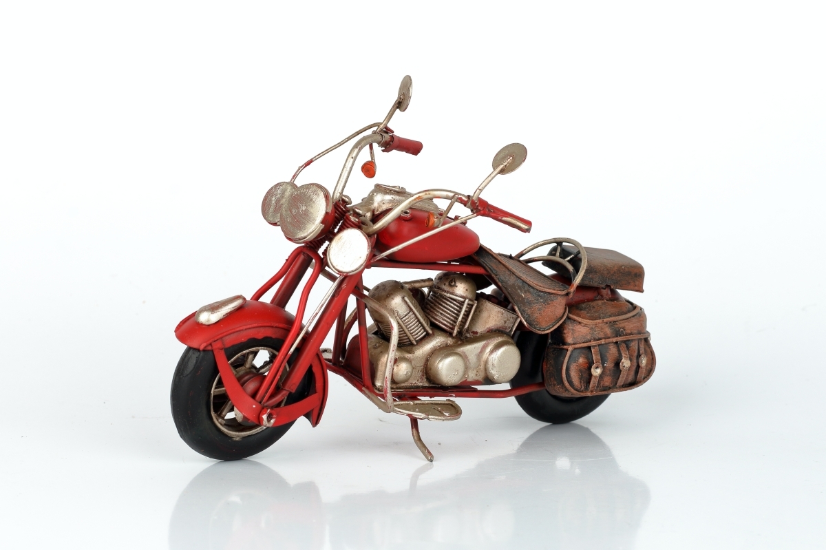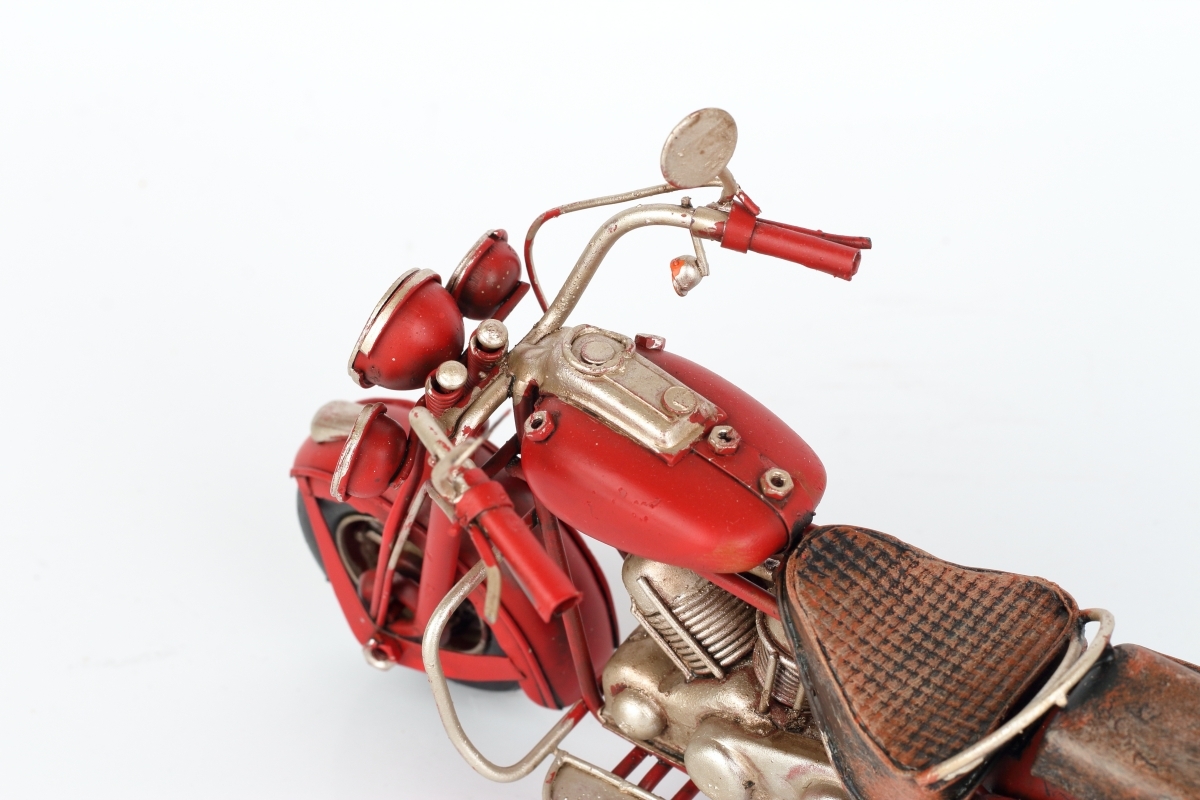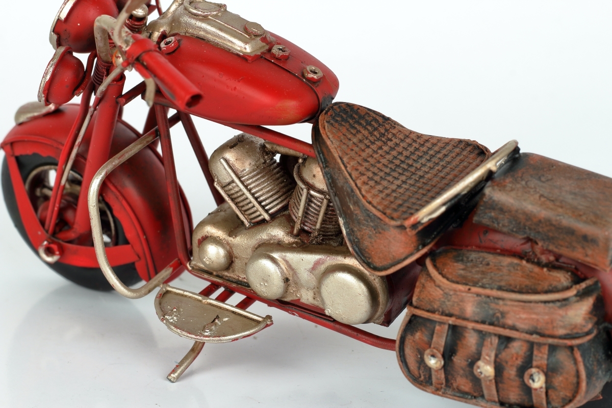 Kovový model motorky s červeným blatníkem a hnědým sedákem
