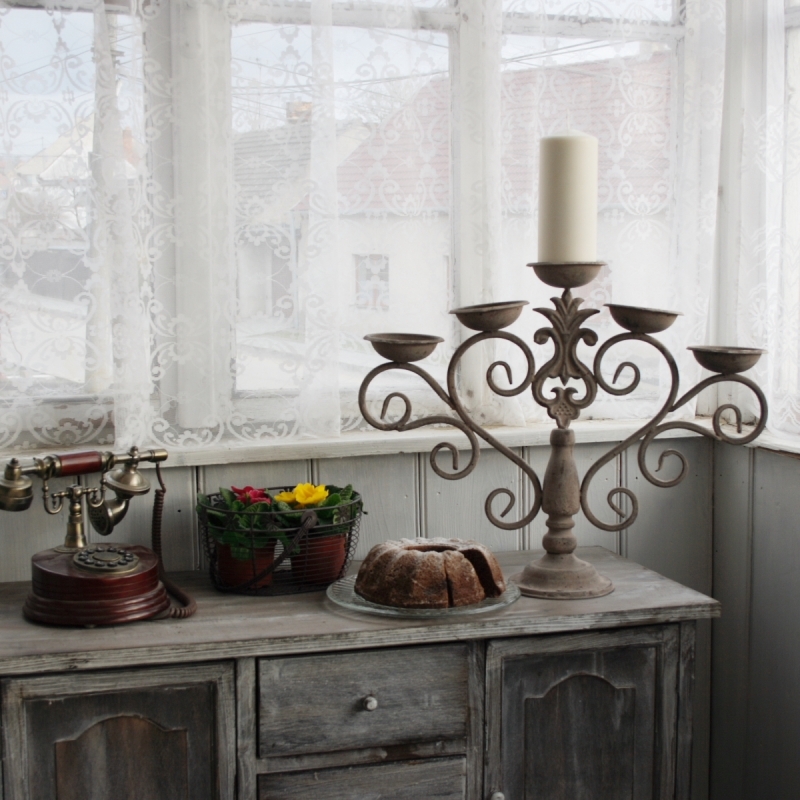 Krásný masivní svícen nejlépe vynikne na venkovské komodě.